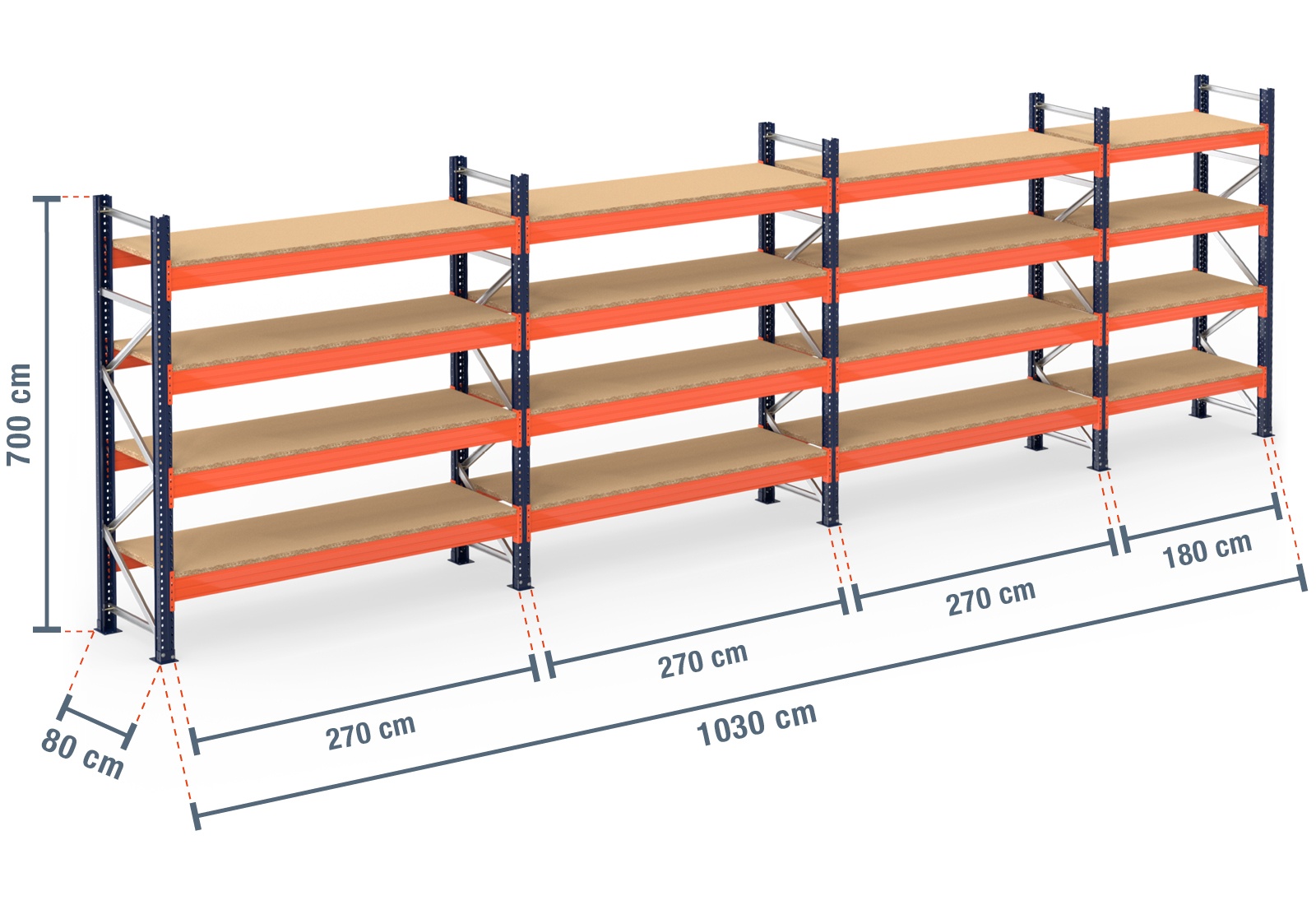 10,3 m pallet racking PR15000 / 80 cm deep / 7 m high / 4 levels / rack layer Wood