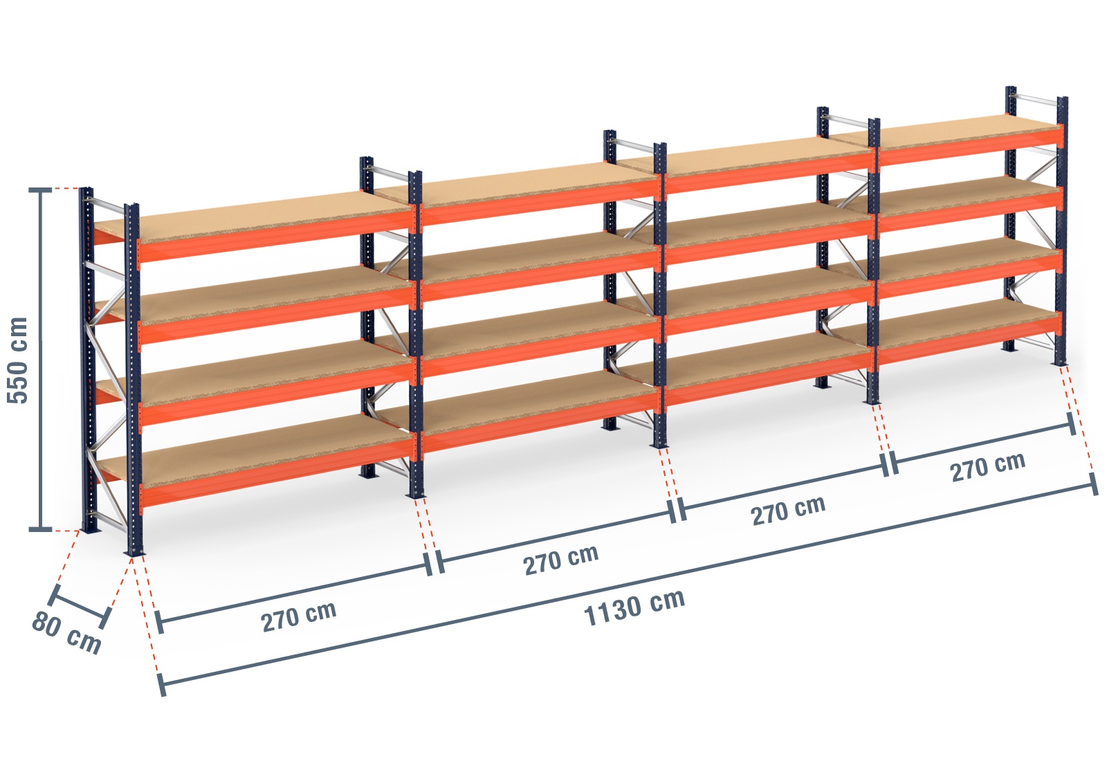 11,3 m pallet racking PR15000 / 80 cm deep / 5,5 m high / 4 levels / rack layer Wood