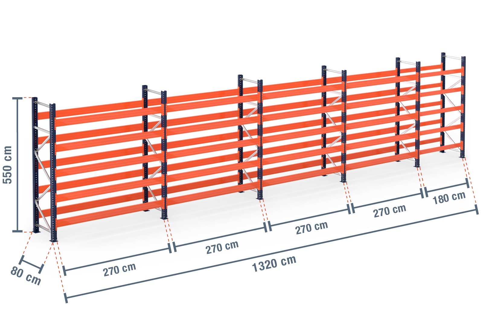 13,2 m pallet rack PR15000 / 80 cm deep / 5,5 m high / 5 levels for 84 euro pallets