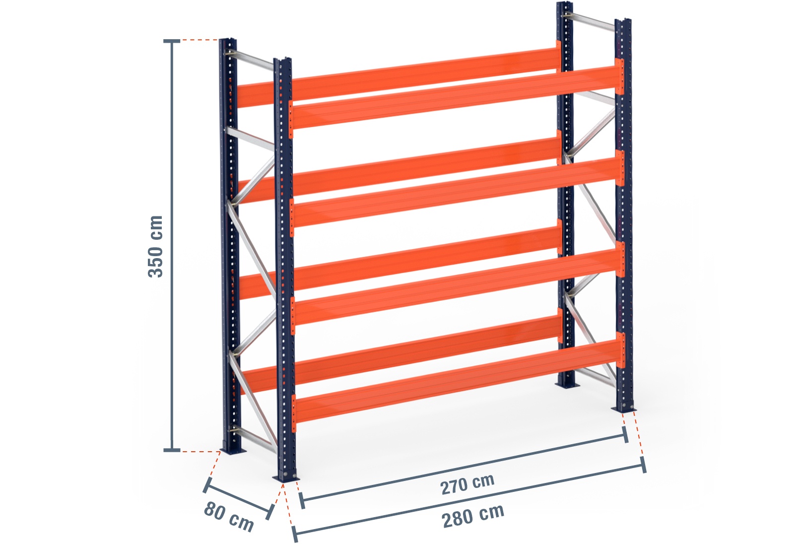 The beams are powder-coated in bright orange for safety in the workplace. They are simply attached to the rack uprights thanks to the plug-in design. Additional safety pins ensure safety by preventing the beam from being accidentally lifted out. The pallet rack uprights are made from two powder-coated upright profiles in blue. The front and rear upright profiles are screwed together with cross struts and diagonal struts for extra stability. For additional security, 2 foot plates per rack upright are mounted at the bottom ends and secured to the floor using bolt anchors. This means our modular pallet racking can be customised while also being highly secure as it is fixed to the floor.