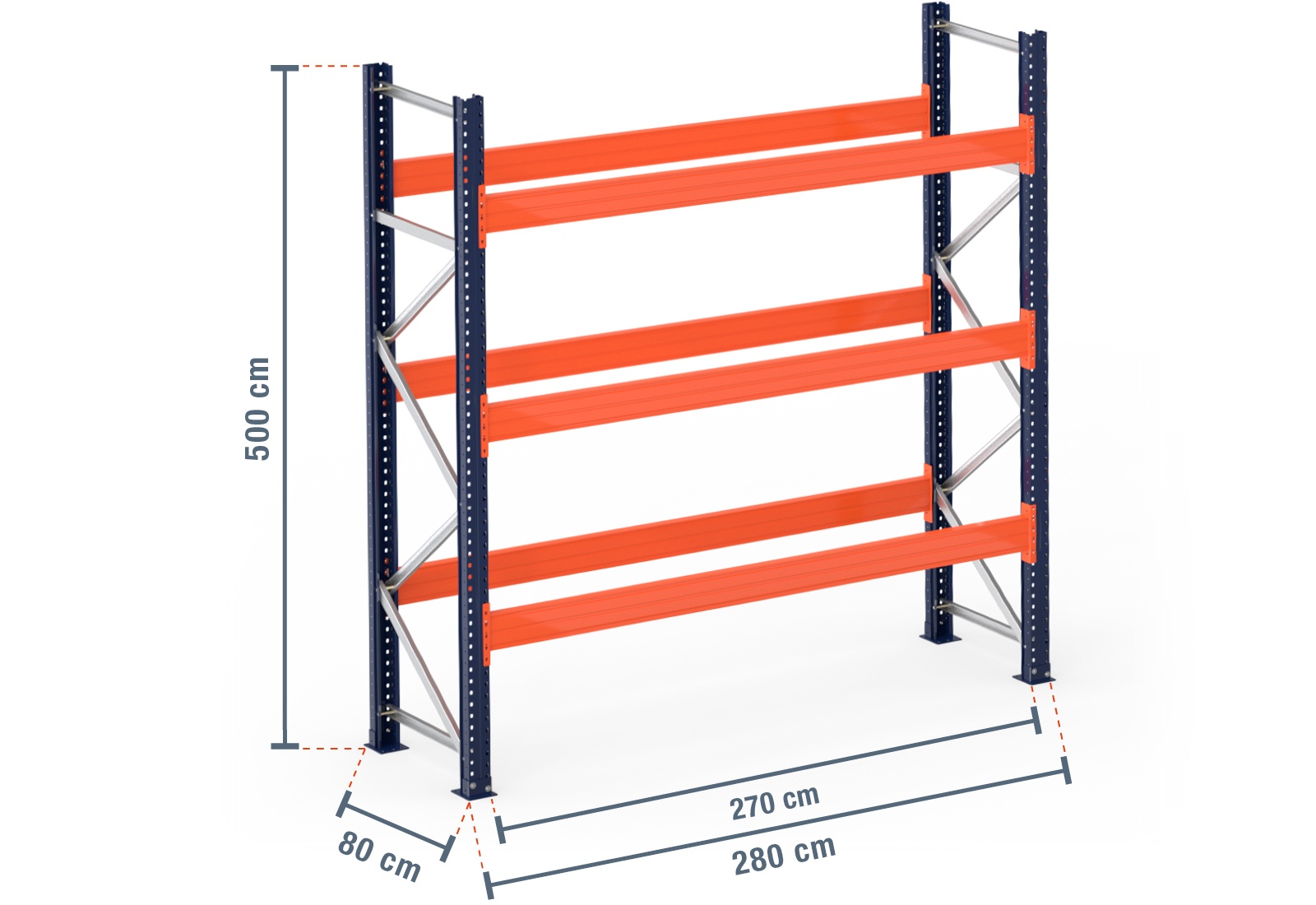 The beams are powder-coated in bright orange for safety in the workplace. They are simply attached to the rack uprights thanks to the plug-in design. Additional safety pins ensure safety by preventing the beam from being accidentally lifted out. The pallet rack uprights are made from two powder-coated upright profiles in blue. The front and rear upright profiles are screwed together with cross struts and diagonal struts for extra stability. For additional security, 2 foot plates per rack upright are mounted at the bottom ends and secured to the floor using bolt anchors. This means our modular pallet racking can be customised while also being highly secure as it is fixed to the floor.
