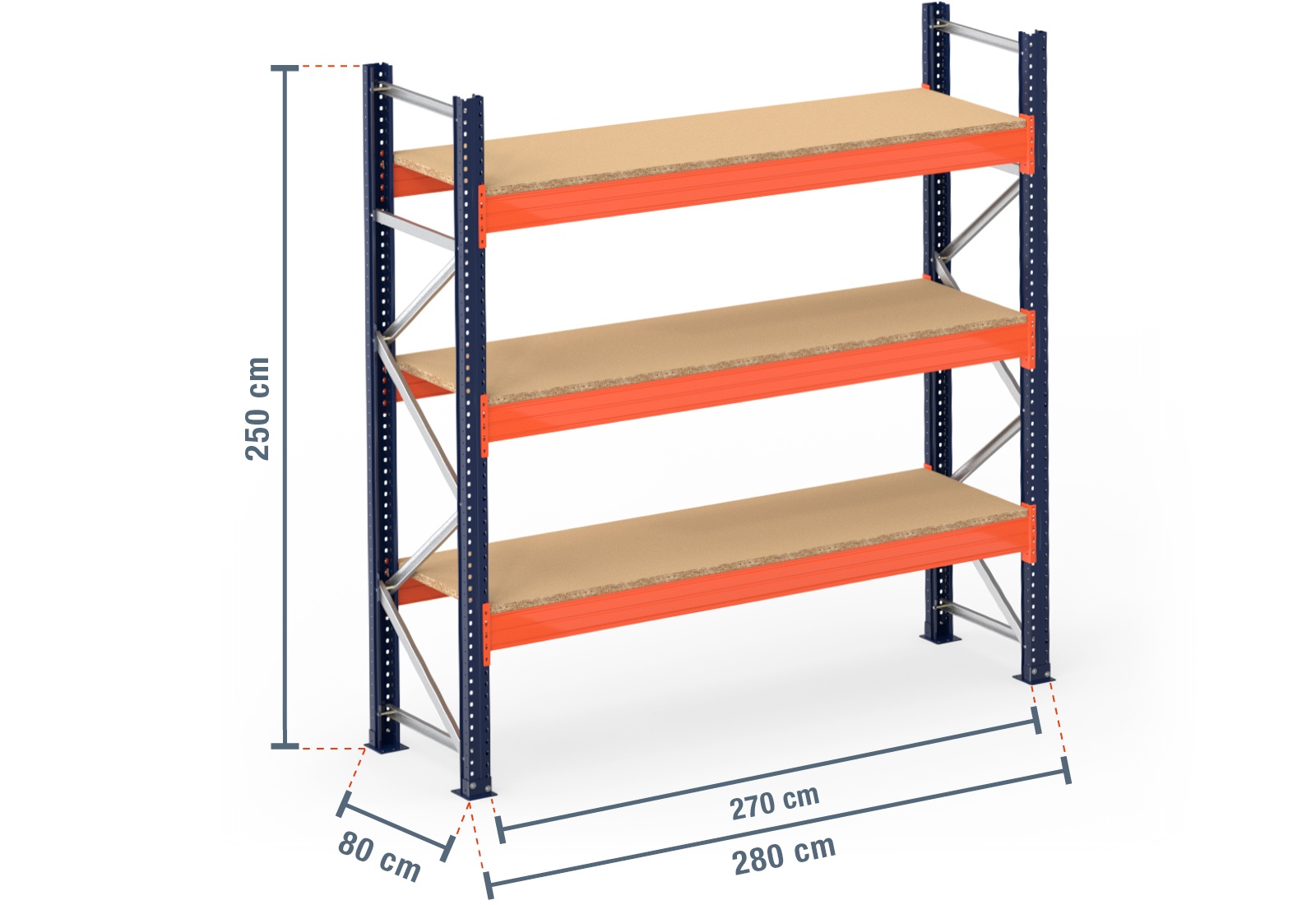 2,8 m pallet racking PR15000 / 80 cm deep / 2,5 m high / 3 levels / rack layer Wood