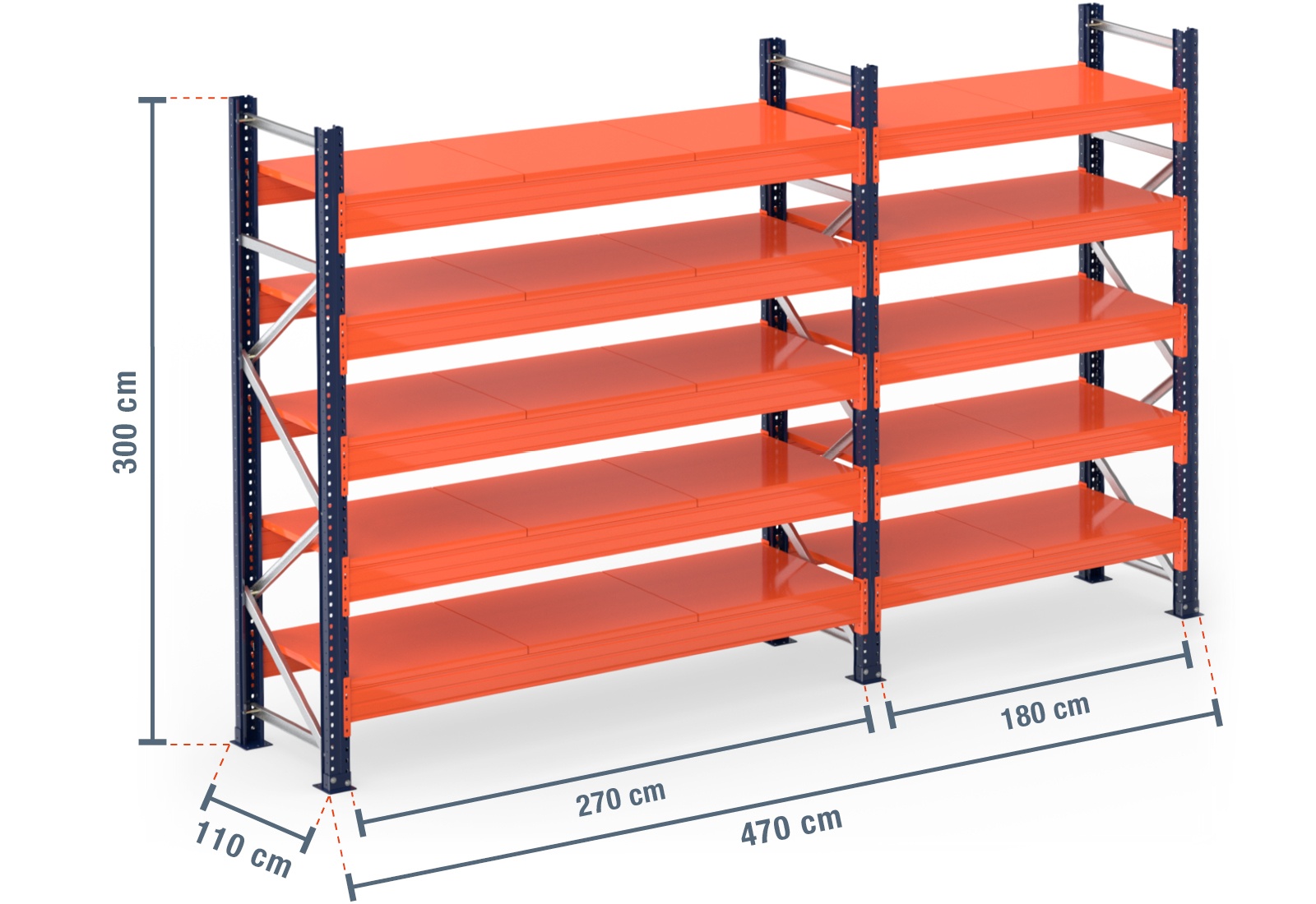 The steel shelf support is extremely durable and robust when compared with wooden boards or mesh shelves. These shelf supports have a long service life and are particularly suitable for the storage of liquids such as paint, oil or fuel. The steel shelf offers a maximum load capacity of 1.000 kg per module with an even weight distribution. It is also painted in the bright signal colour of orange. This ensures safety as the shelves can be easily seen from a distance. Its special design enables the steel shelf to be secured to the beams themselves, so it simply needs to be placed in position. When loading your pallet rack, please observe the maximum shelf and unit loads specified.