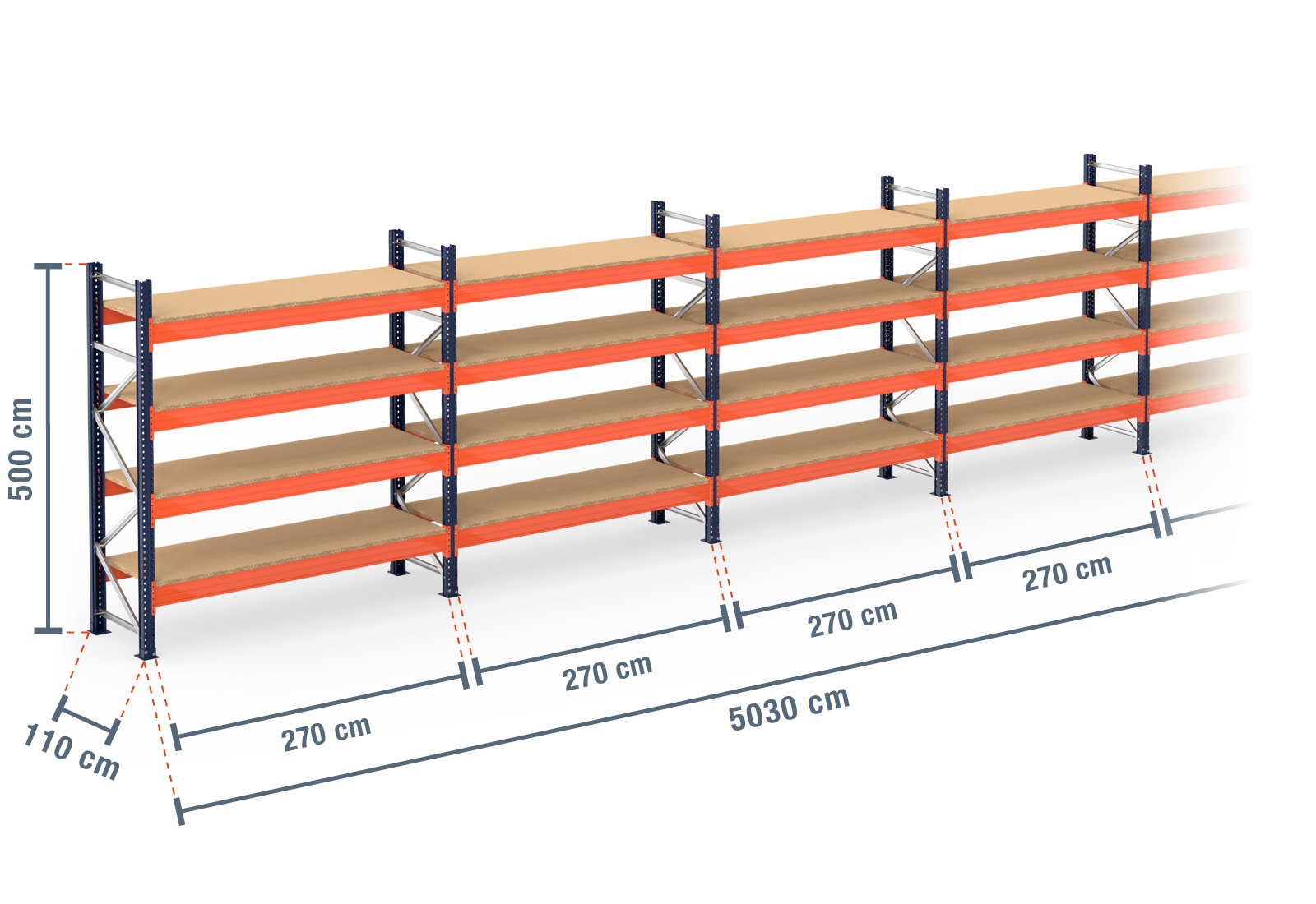 50,3 m pallet racking PR15000 / 110 cm deep / 5 m high / 4 levels / rack layer Wood