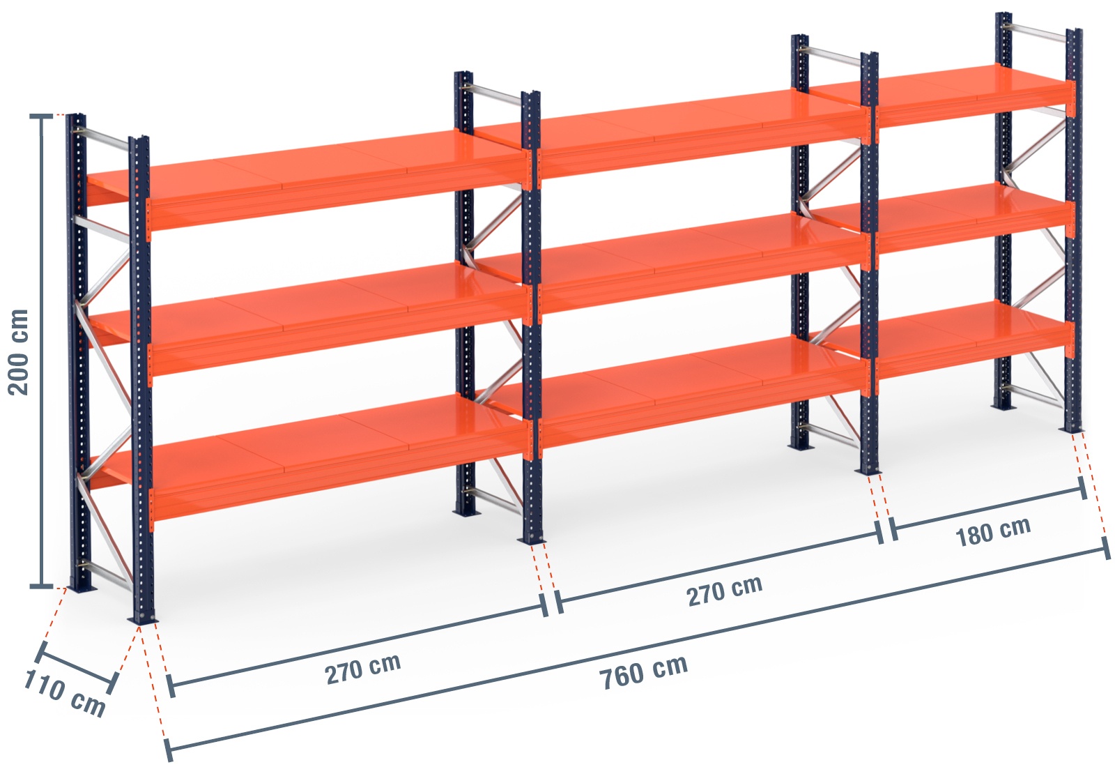 7,6 m pallet racking PR15000 / 110 cm deep / 2 m high / 3 levels / rack layer Steel