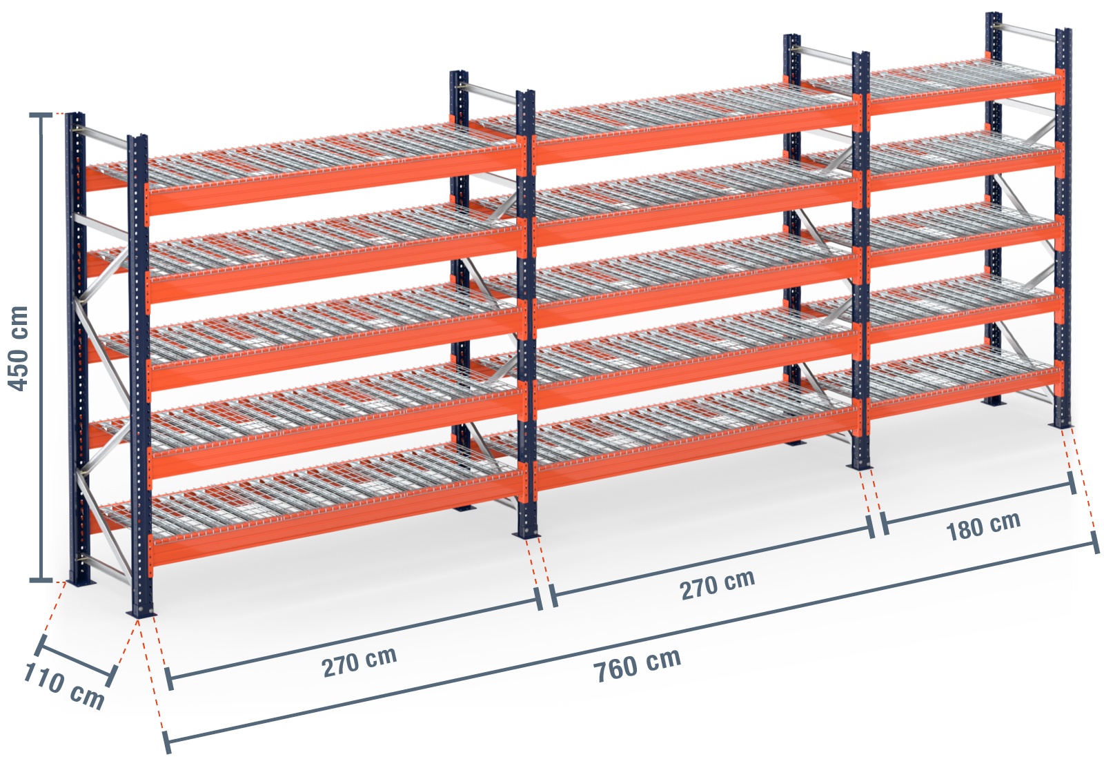 7,6 m pallet racking PR15000 / 110 cm deep / 4,5 m high / 5 levels / rack layer Wire mesh