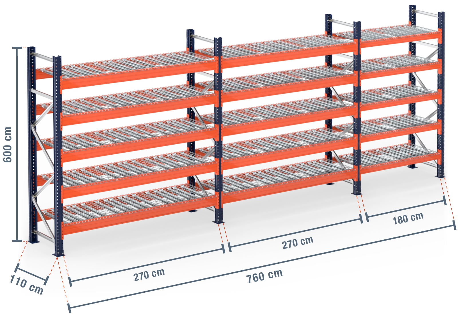 7,6 m pallet racking PR15000 / 110 cm deep / 6 m high / 5 levels / rack layer Wire mesh