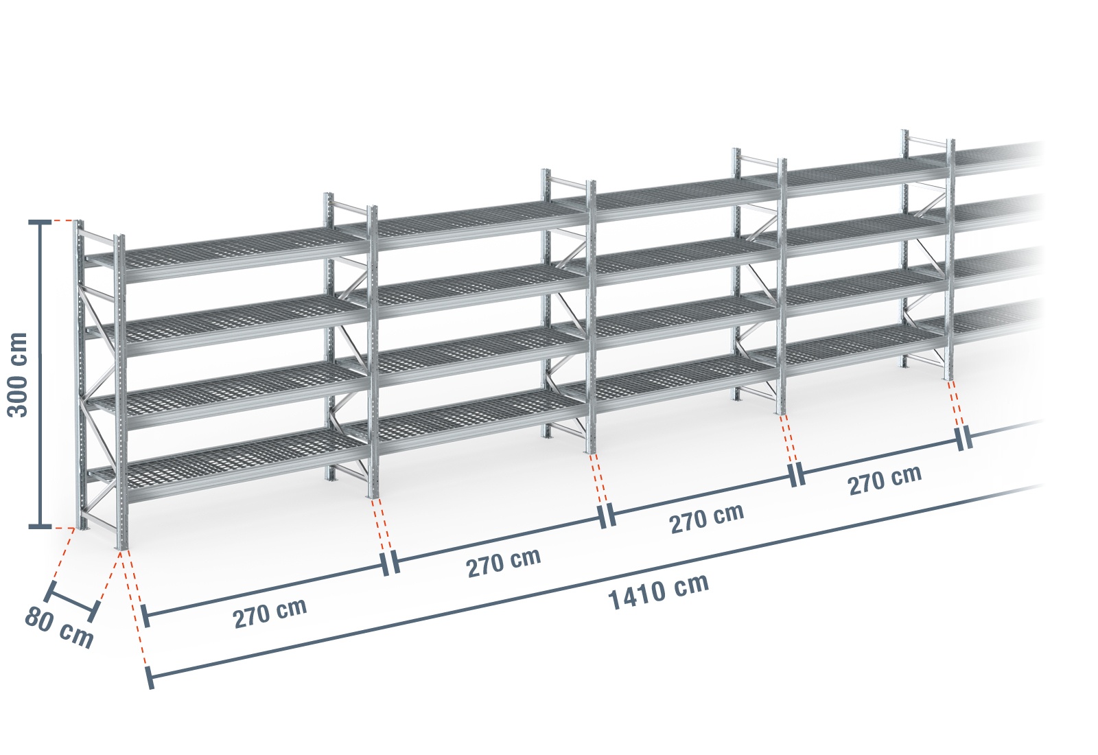 14,1 m pallet rack PR9000F galvanised / 80 cm deep / 3 m high / 4 levels / rack layer Galvanised mesh