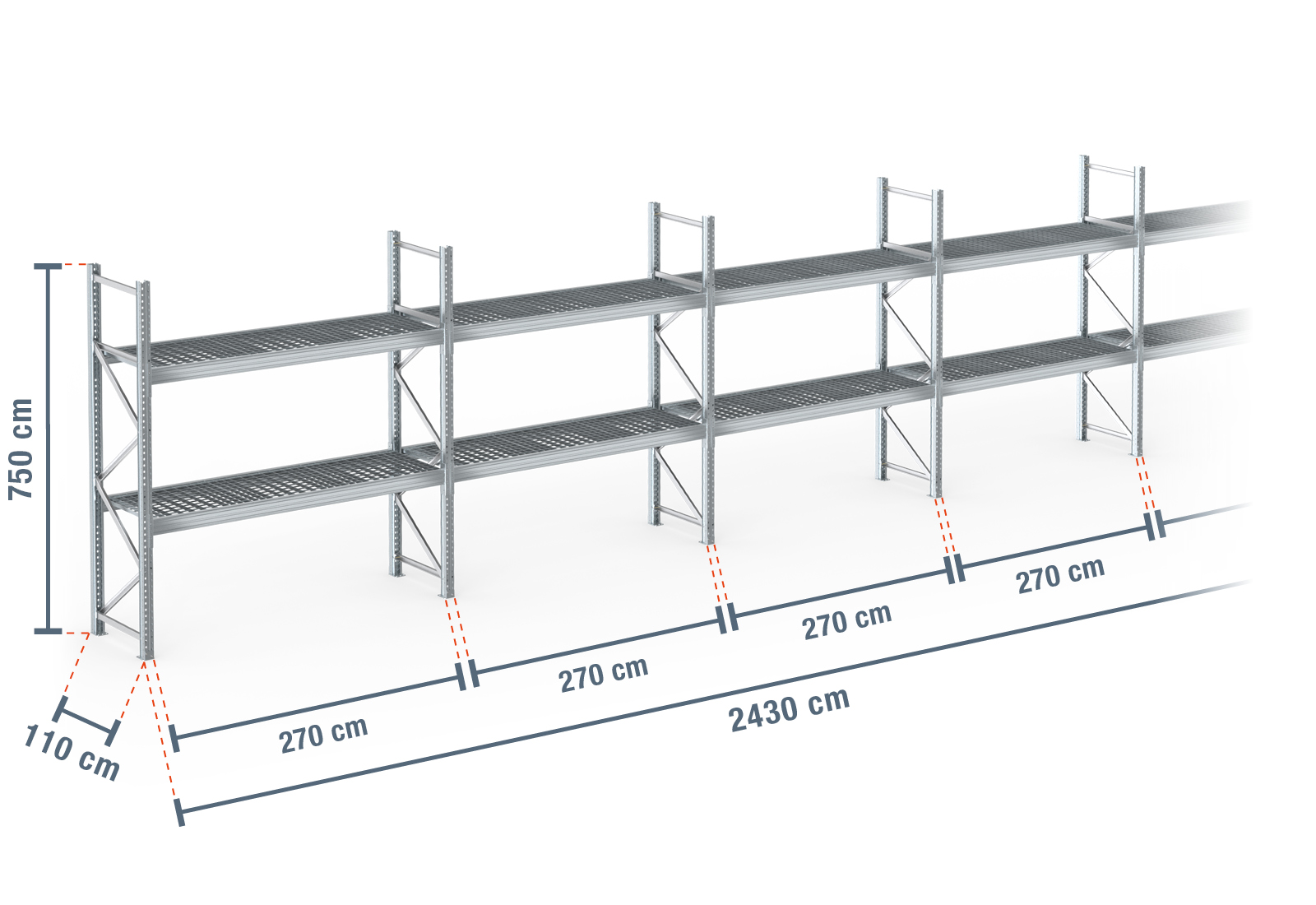 24,3 m pallet rack PR9000F galvanised / 110 cm deep / 7,5 m high / 2 levels / rack layer Galvanised mesh