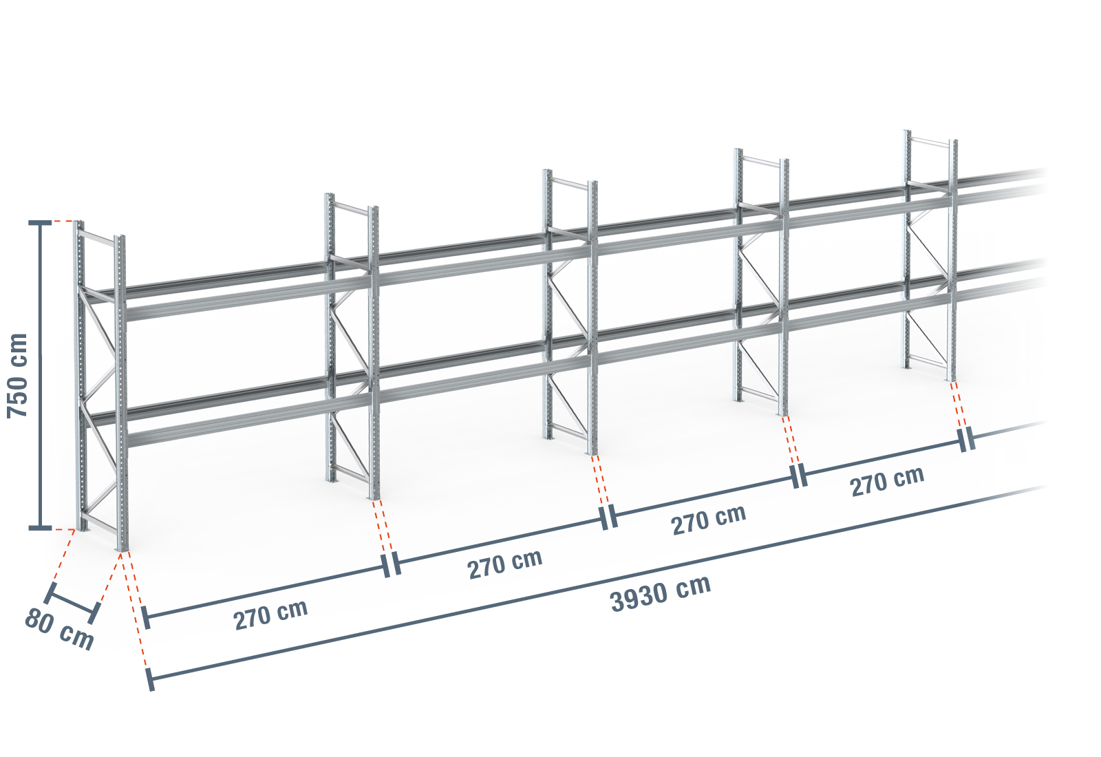 39,3 m pallet rack PR9000F galvanised / 80 cm deep / 7,5 m high / 2 levels for 126 euro pallets