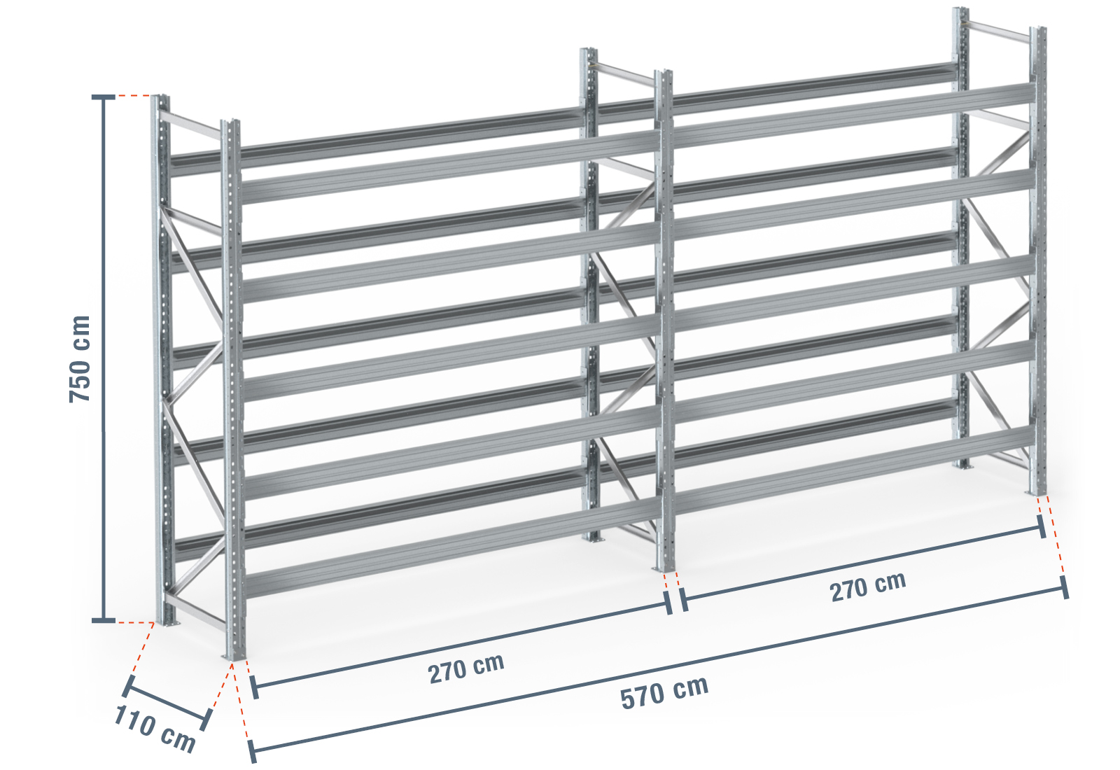 5,7 m pallet rack PR9000F galvanised / 110 cm deep / 7,5 m high / 5 levels for 36 euro pallets