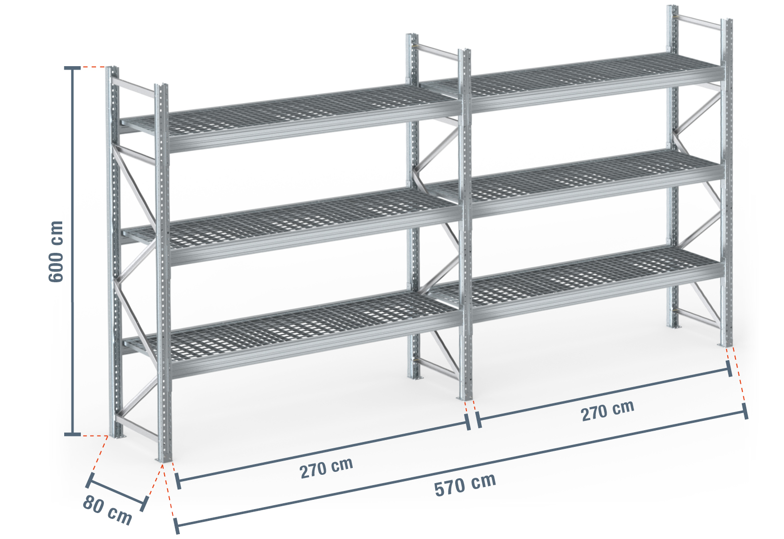 5,7 m pallet rack PR9000F galvanised / 80 cm deep / 6 m high / 3 levels / rack layer Galvanised mesh