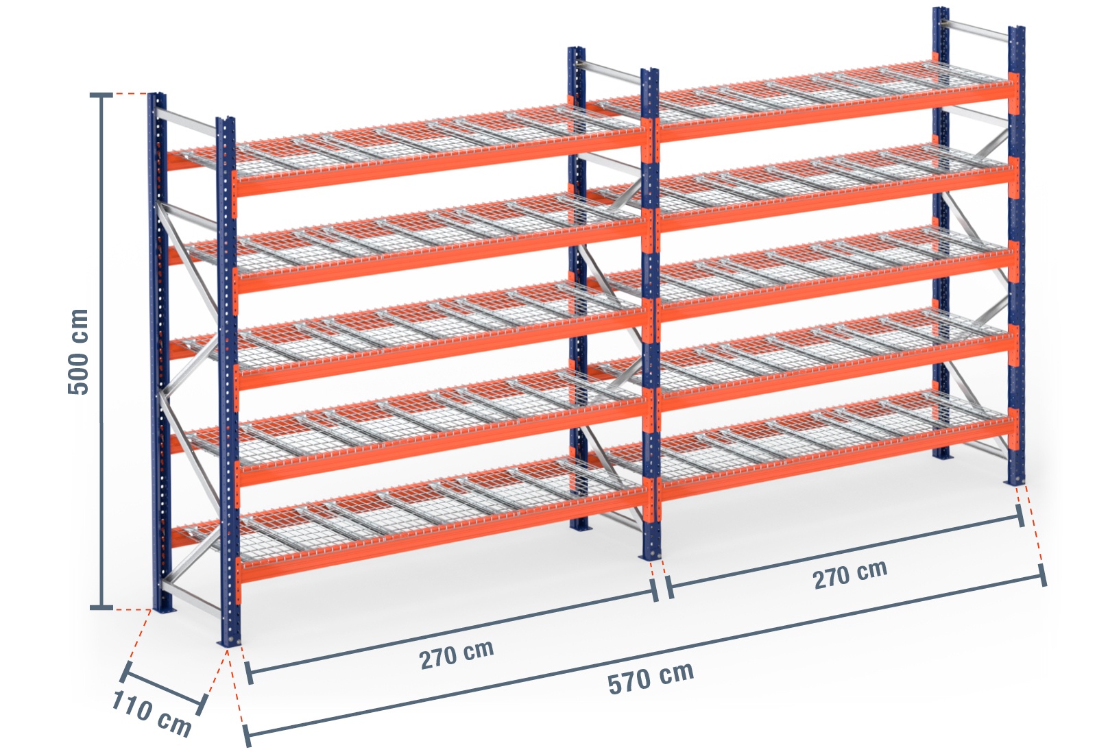 5,7 m pallet racking PR9000 / 110 cm deep / 5 m high / 5 levels / rack layer Wire mesh