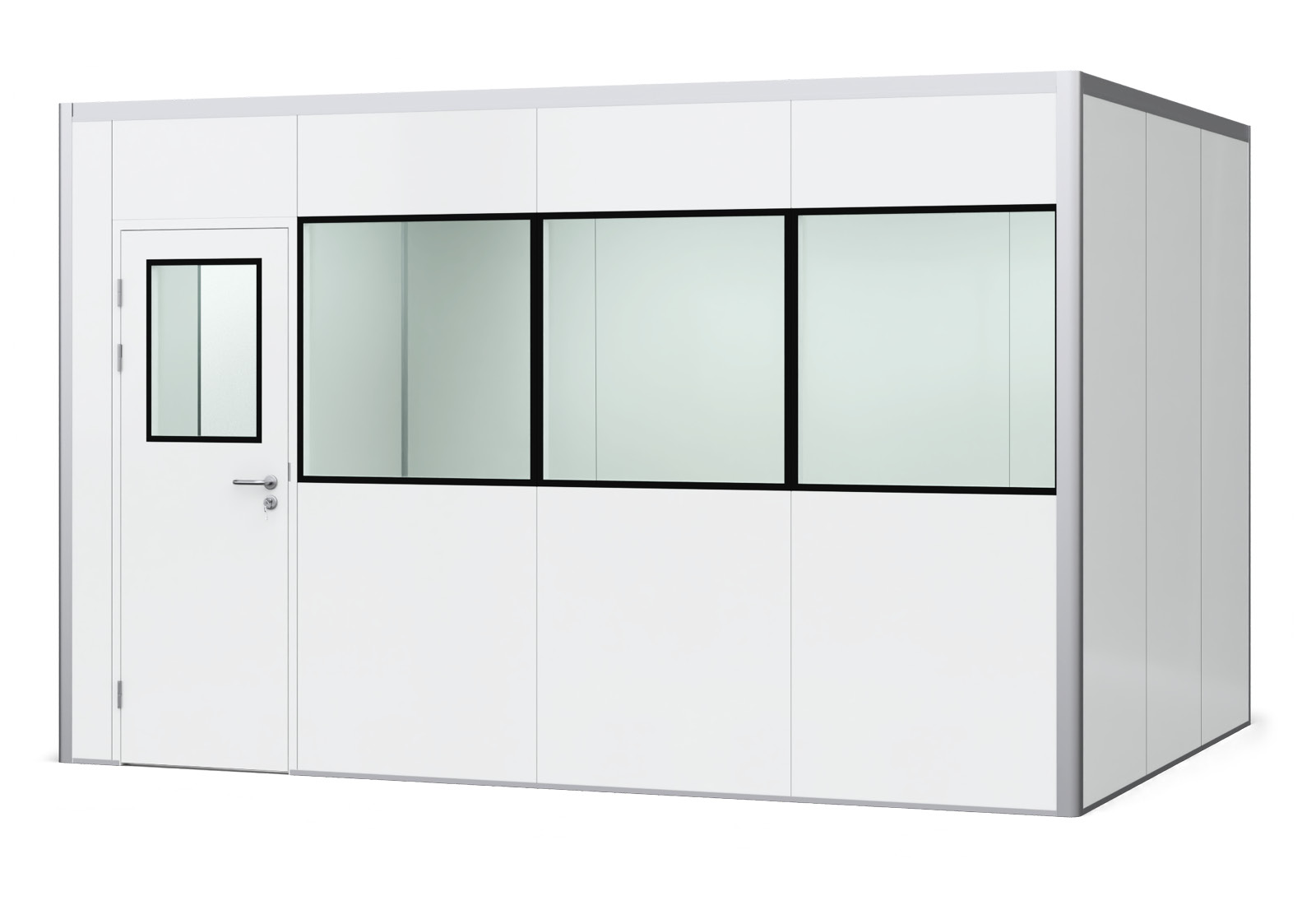 The height (2.500 mm internal dimension | 2.550 mm external dimension) and room depth (3.000 mm internal dimension | 3.100 mm external dimension) always remain the same. The material of the panels, built in sandwich construction, consists of steel on the outside and inside (white, spray-painted, steel) and rock wool in the middle as an insulating layer. This means that the panels are not exactly lightweight (11 kg/m²) but very stable and that little noise from the often noisy hall environment penetrates into the room-in-room system. The insulation value is between 20 - 40 dB depending on the outside noise level. The thermal insulation value of PREFAB hall offices is 0,787 W/(m²K) and the thermal conductivity is 0,05 W/(mK).
