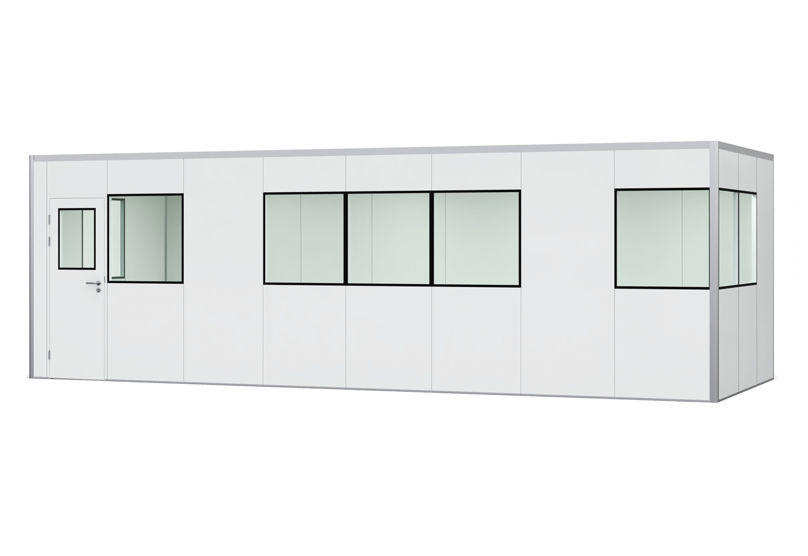 The height (2.500 mm internal dimension | 2.550 mm external dimension) and room depth (3.000 mm internal dimension | 3.100 mm external dimension) always remain the same. The material of the panels, built in sandwich construction, consists of steel on the outside and inside (white, spray-painted, steel) and rock wool in the middle as an insulating layer. This means that the panels are not exactly lightweight (11 kg/m²) but very stable and that little noise from the often noisy hall environment penetrates into the room-in-room system. The insulation value is between 20 - 40 dB depending on the outside noise level. The thermal insulation value of PREFAB hall offices is 0,787 W/(m²K) and the thermal conductivity is 0,05 W/(mK).