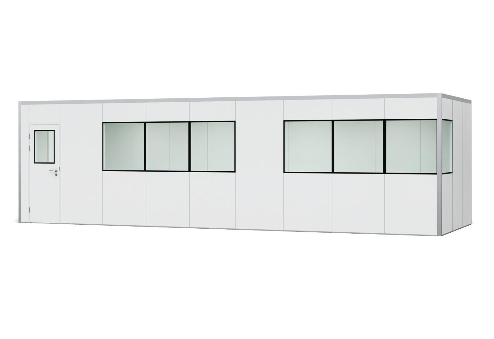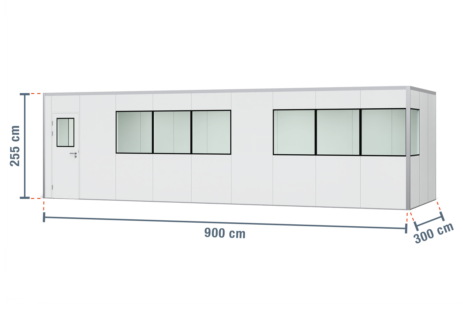 The height (2.500 mm internal dimension | 2.550 mm external dimension) and room depth (3.000 mm internal dimension | 3.100 mm external dimension) always remain the same. The material of the panels, built in sandwich construction, consists of steel on the outside and inside (white, spray-painted, steel) and rock wool in the middle as an insulating layer. This means that the panels are not exactly lightweight (11 kg/m²) but very stable and that little noise from the often noisy hall environment penetrates into the room-in-room system. The insulation value is between 20 - 40 dB depending on the outside noise level. The thermal insulation value of PREFAB hall offices is 0,787 W/(m²K) and the thermal conductivity is 0,05 W/(mK).