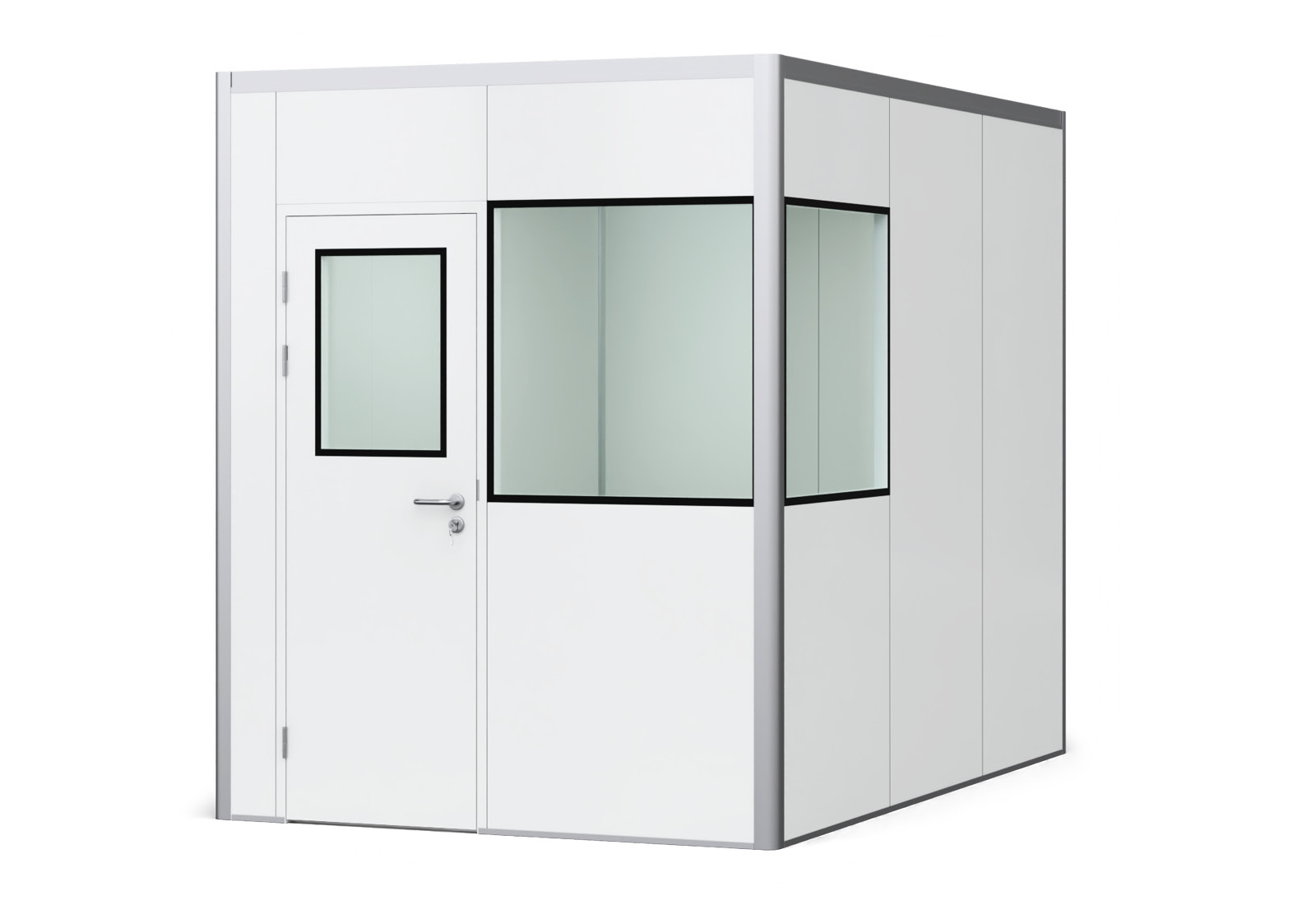 The height (2.500 mm internal dimension | 2.550 mm external dimension) and room depth (3.000 mm internal dimension | 3.100 mm external dimension) always remain the same. The material of the panels, built in sandwich construction, consists of steel on the outside and inside (white, spray-painted, steel) and rock wool in the middle as an insulating layer. This means that the panels are not exactly lightweight (11 kg/m²) but very stable and that little noise from the often noisy hall environment penetrates into the room-in-room system. The insulation value is between 20 - 40 dB depending on the outside noise level. The thermal insulation value of PREFAB hall offices is 0,787 W/(m²K) and the thermal conductivity is 0,05 W/(mK).