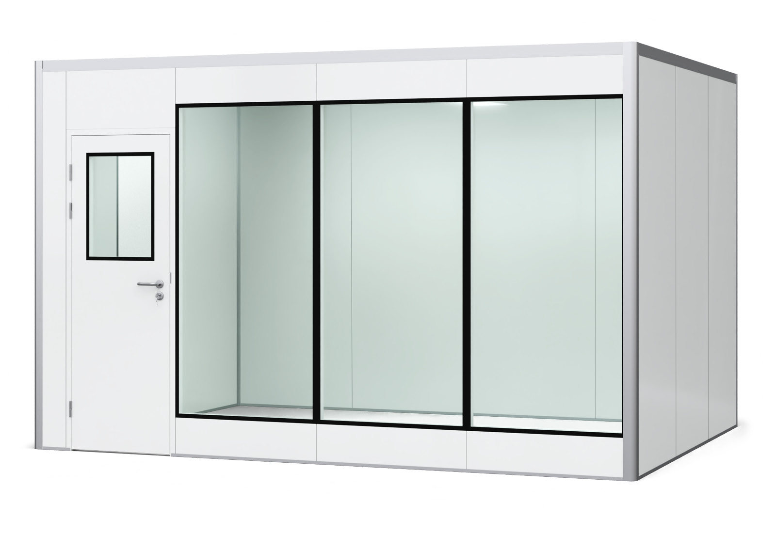 The height (2.50 m internal dimension | 2.55 m external dimension) and room depth (3 m internal dimension | 3.10 m external dimension) always remain the same. The material of the panels, built in sandwich construction, consists of steel (white, spray-painted, 0.4 mm steel) on the outside and inside and rock wool as an insulating layer in the middle. This means that the panels are not exactly lightweight (11 kg/m²) but very stable and that little noise from the often noisy hall environment penetrates into the room-in-room system. The insulation value is between 20 - 40 dB depending on the outside noise level. The thermal insulation value of the PREFAB hall offices is 0,787 W/(m²K) and the thermal conductivity 0,05 W/(mK).