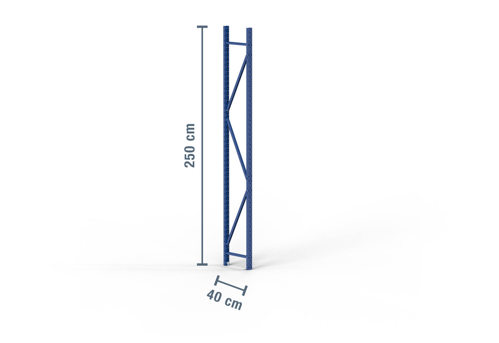 Storage rack upright made of cold-rolled steel with a height of 2,5 m and a depth of 40 cm. The unit load capacity (max. load between two storage rack uprights) is 2.000 kg. The powder coating in blue protects the rack upright against corrosion. It is secured to the floor with M8 x 55 mm bolt anchors to provide stability for the complete storage rack.
