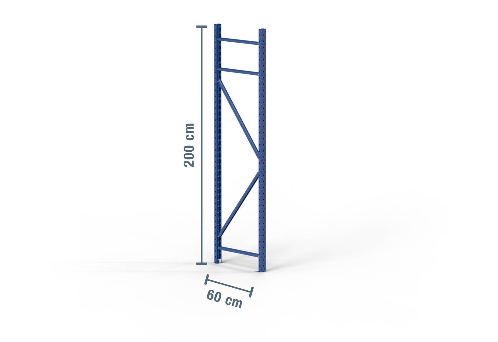 Storage rack upright made of cold-rolled steel with a height of 2 m and a depth of 60 cm. The unit load capacity (max. load between two storage rack uprights) is 2.000 kg. The powder coating in blue protects the rack upright against corrosion. It is secured to the floor with M8 x 55 mm bolt anchors to provide stability for the complete storage rack.