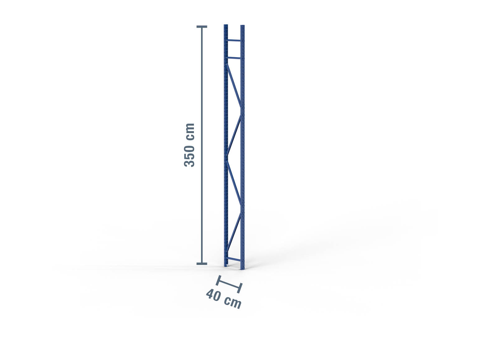 Storage rack upright made of cold-rolled steel with a height of 3,5 m and a depth of 40 cm. The unit load capacity (max. load between two storage rack uprights) is 2.000 kg. The powder coating in blue protects the rack upright against corrosion. It is secured to the floor with M8 x 55 mm bolt anchors to provide stability for the complete storage rack.