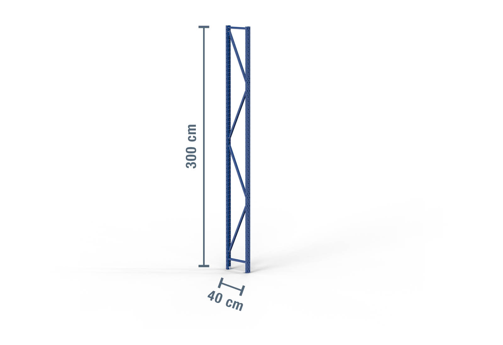 Storage rack upright made of cold-rolled steel with a height of 3 m and a depth of 40 cm. The unit load capacity (max. load between two storage rack uprights) is 2.000 kg. The powder coating in blue protects the rack upright against corrosion. It is secured to the floor with M8 x 55 mm bolt anchors to provide stability for the complete storage rack.