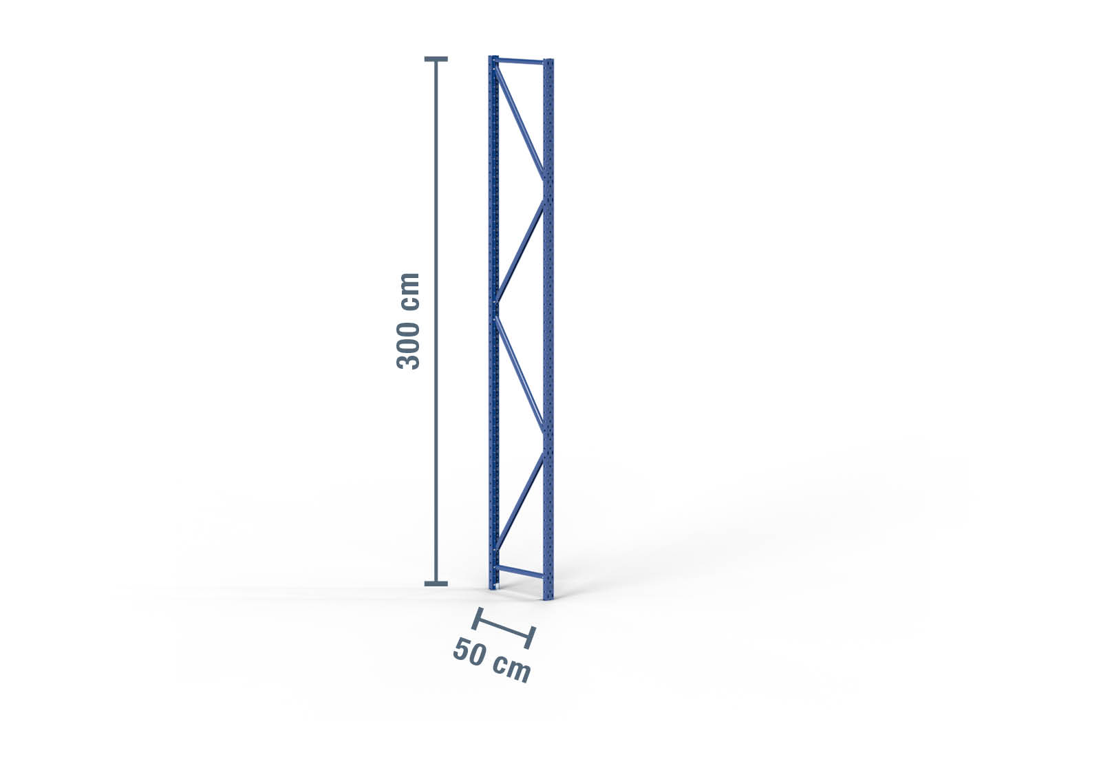Storage rack upright made of cold-rolled steel with a height of 3 m and a depth of 50 cm. The unit load capacity (max. load between two storage rack uprights) is 2.000 kg. The powder coating in blue protects the rack upright against corrosion. It is secured to the floor with M8 x 55 mm bolt anchors to provide stability for the complete storage rack.