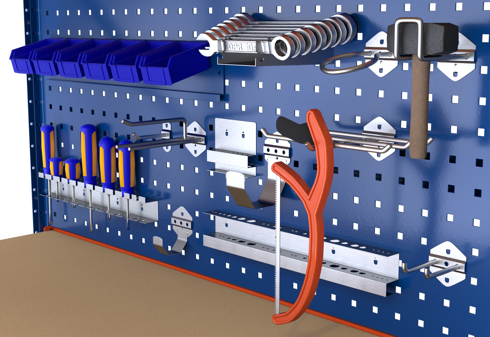 This range is ideally suited to store any tool that can be hung up / boxes with hooks, etc. such as pliers, open-end spanners, cordless screwdrivers, drill bits, cables, ropes, tubes, saws, etc.