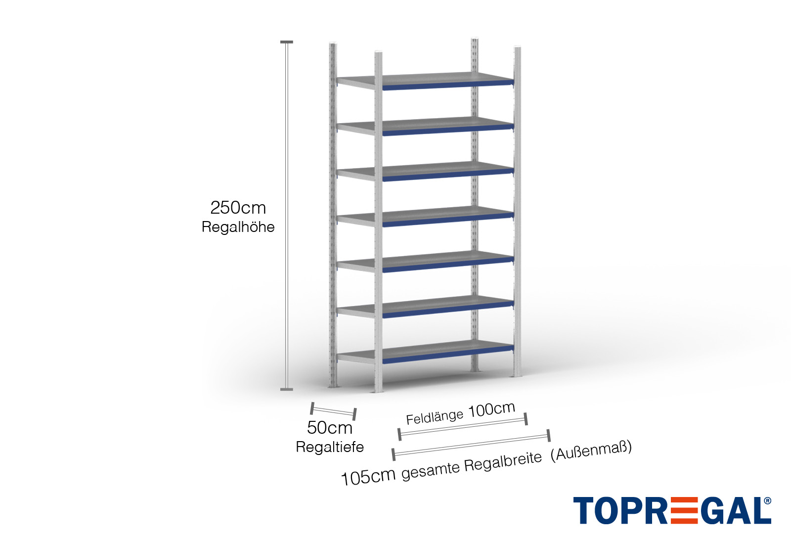 1 m heavy duty shelf FB200 / 50 cm deep / 2,5 m high / 7 levels / rack layer Steel / compartment load capacity 200 kg