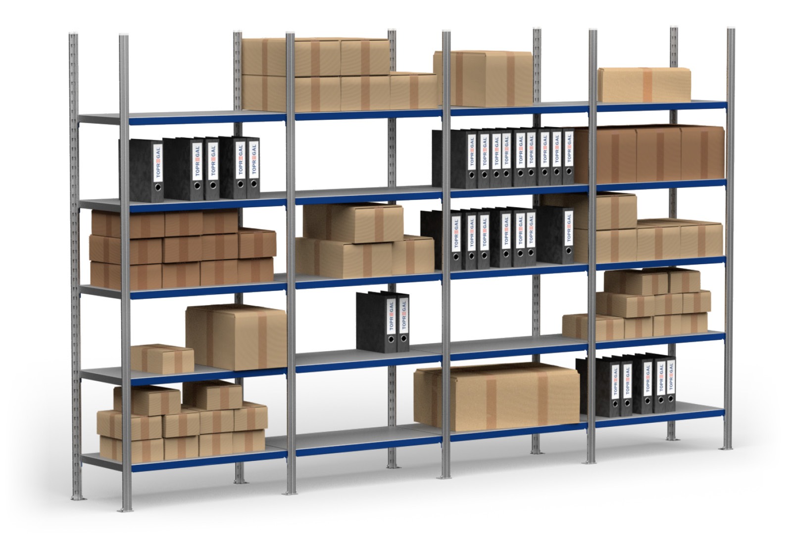 In this rack type, the beams are used to secure the shelves. The integrated kerb makes it easy to insert the shelves. These have a standard length of 100 cm and fit perfectly into the compartments of the shelving rack. This means the rack with its 5 levels is quick and easy to assemble.