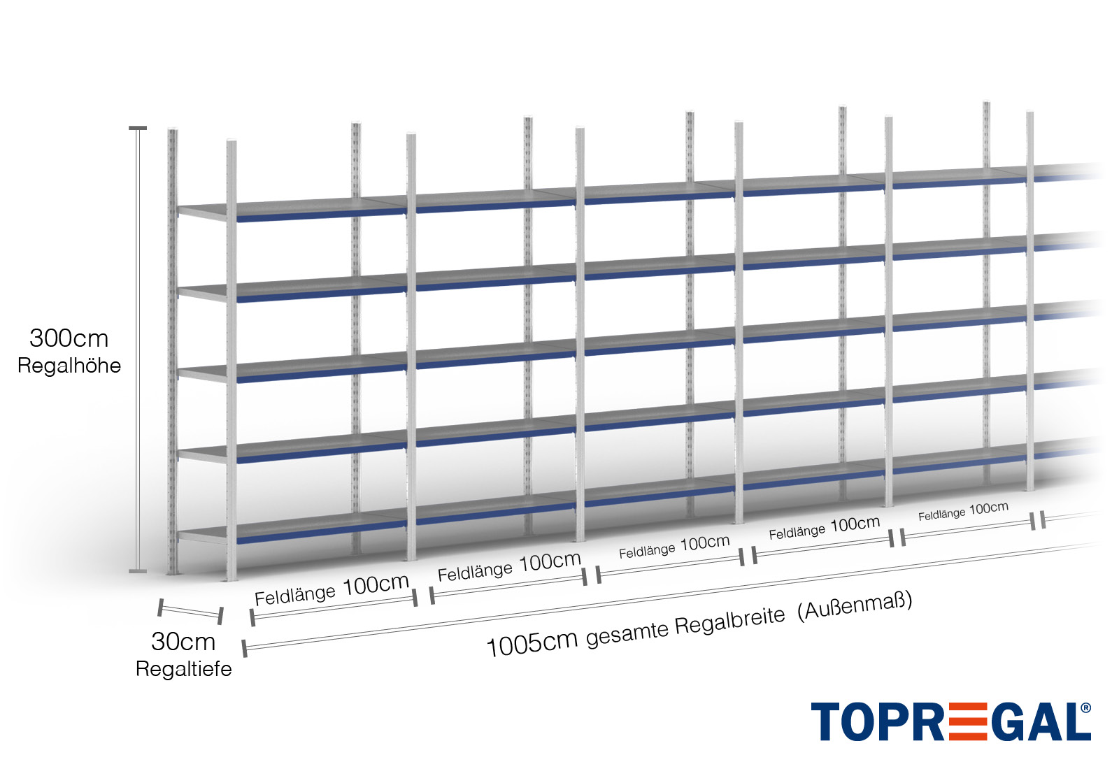 All data refer to evenly distributed loads. When loaded, the shelf load and field load must not be exceeded. In principle, the current guidelines on safety and health at work (german DGUV Rule 208-061) apply during use. TOPREGAL accepts no liability for accidents/damage caused by improper use. Our expert advisory team will be pleased to answer any questions you may have. Dimensions given are approximate and may deviate by a few centimetres. Contact us if you need the exact dimensions for your desired product.