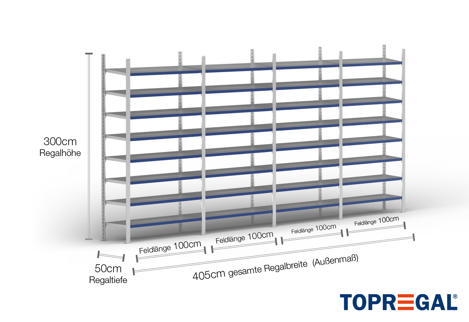 All data refer to evenly distributed loads. When loaded, the shelf load and field load must not be exceeded. In principle, the current guidelines on safety and health at work (german DGUV Rule 208-061) apply during use. TOPREGAL accepts no liability for accidents/damage caused by improper use. Our expert advisory team will be pleased to answer any questions you may have. Dimensions given are approximate and may deviate by a few centimetres. Contact us if you need the exact dimensions for your desired product.