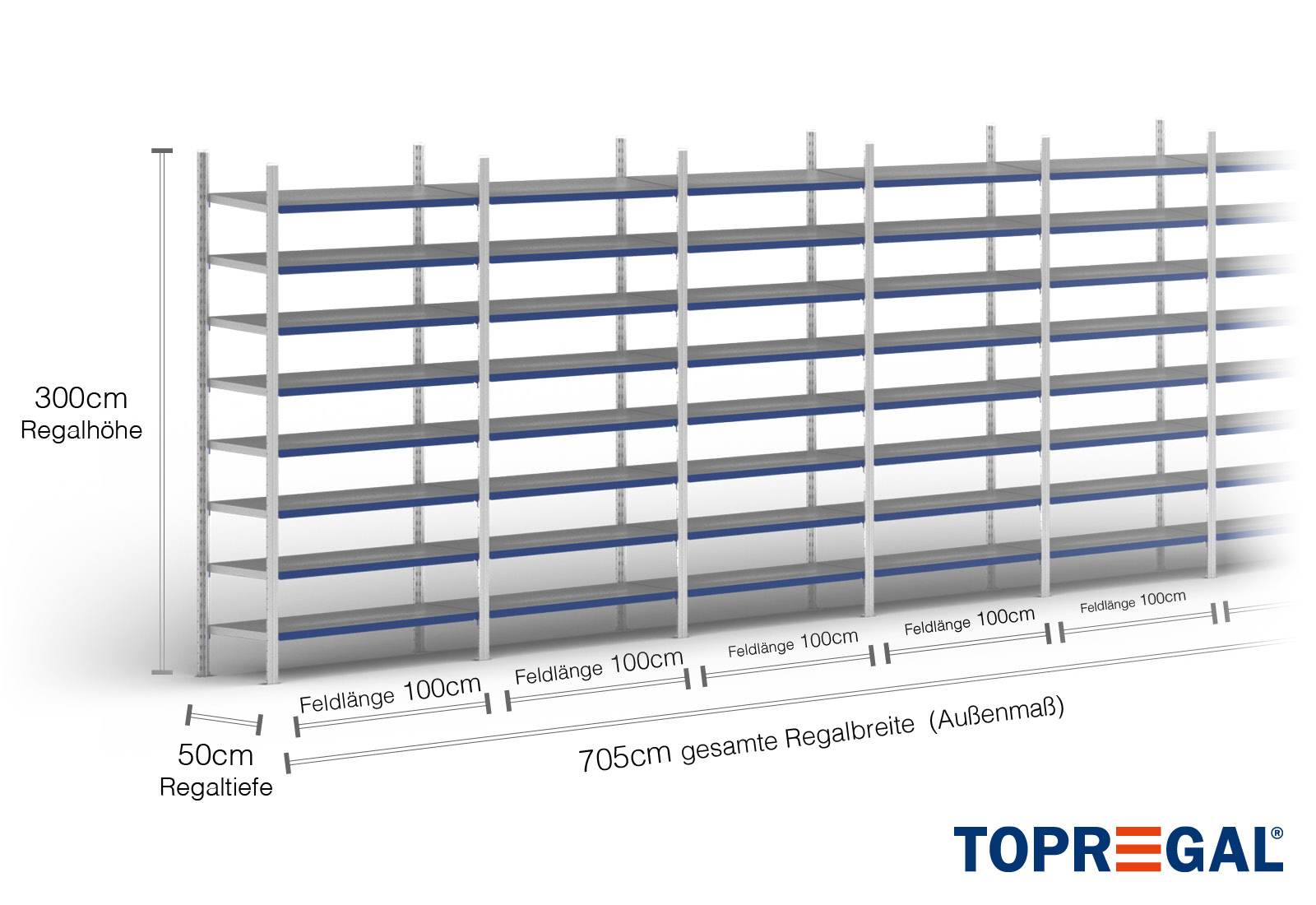 All data refer to evenly distributed loads. When loaded, the shelf load and field load must not be exceeded. In principle, the current guidelines on safety and health at work (german DGUV Rule 208-061) apply during use. TOPREGAL accepts no liability for accidents/damage caused by improper use. Our expert advisory team will be pleased to answer any questions you may have. Dimensions given are approximate and may deviate by a few centimetres. Contact us if you need the exact dimensions for your desired product.