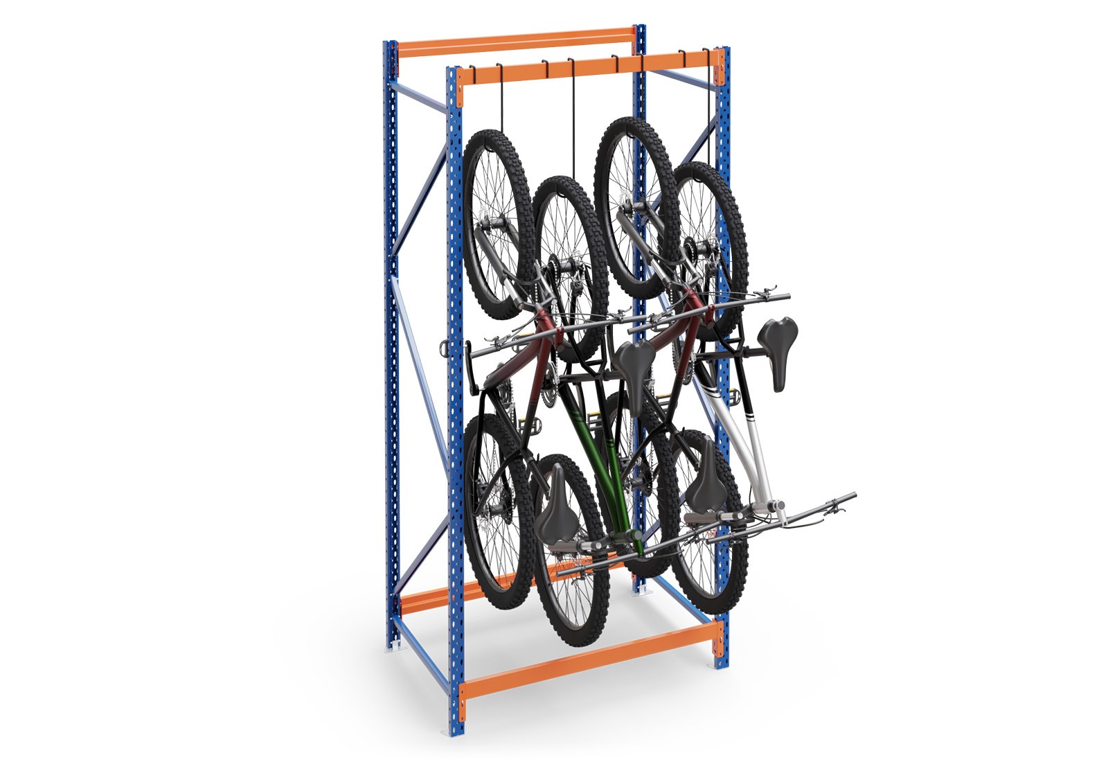 The 334 mm or 525 mm long bike hooks ensure that the stored bikes can hang safely and compactly next to each other, as the handlebars of the bikes are at different heights. This means that the bikes take up hardly any space and you can make optimum use of the available space. Whether it's a bike shop, workshop or bike hire. With the bicycle racks from TOPREGAL, you are on the safe side when it comes to supporting ecological passenger transport. The robust steel racks, with their orange-blue paint finish, are ideal for indoor areas and the storage of e-bikes.