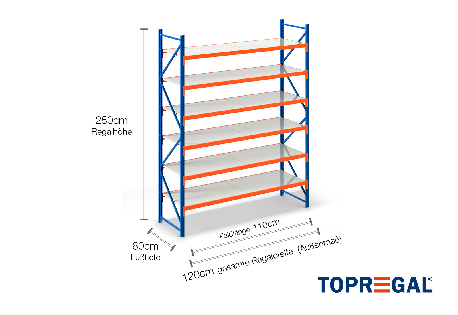 All data refer to evenly distributed loads. When loaded, the shelf load and field load must not be exceeded. In principle, the current guidelines on safety and health at work (german DGUV Rule 208-061) apply during use. TOPREGAL accepts no liability for accidents/damage caused by improper use. Our expert advisory team will be pleased to answer any questions you may have. Dimensions given are approximate and may deviate by a few centimetres. Contact us if you need the exact dimensions for your desired product.