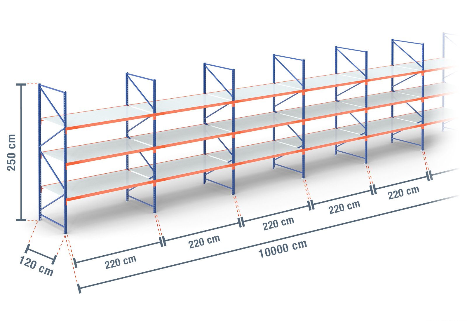 100 m storage rack LR2000 / 120 cm deep / 2,5 m high / 3 levels / rack layer Steel