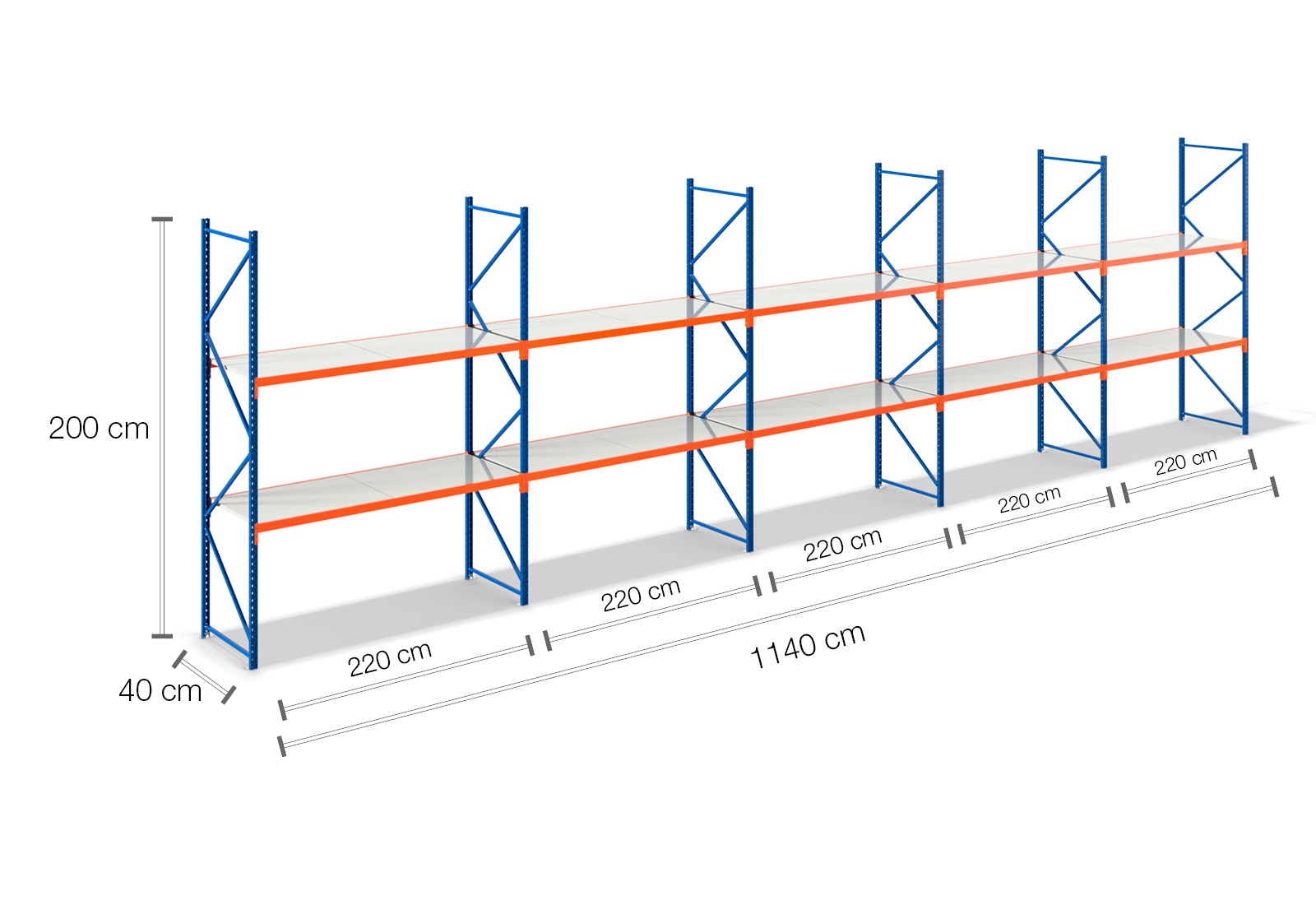 11,4 m storage rack LR2000 / 40 cm deep / 2 m high / 2 levels / rack layer Steel