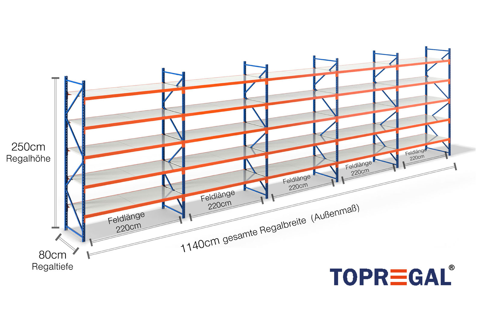 11,4 m storage rack LR2000 / 80 cm deep / 2,5 m high / 5 levels / rack layer Steel