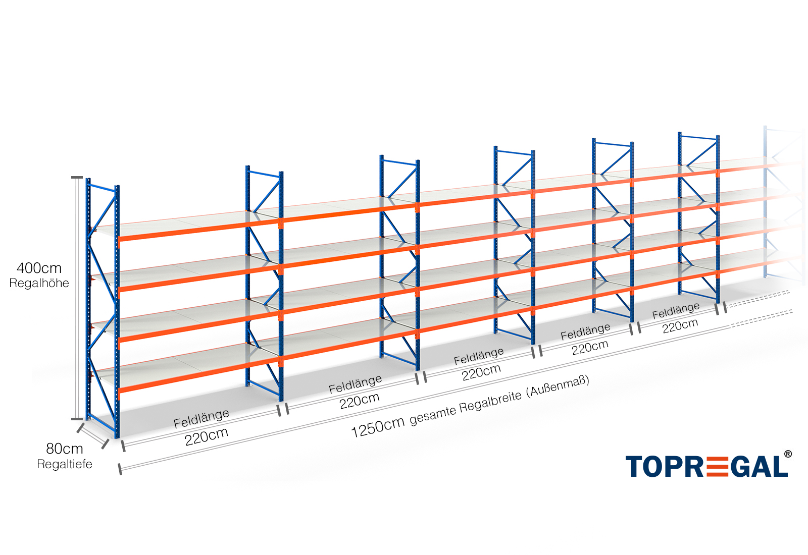 All data refer to evenly distributed loads. When loaded, the shelf load and field load must not be exceeded. In principle, the current guidelines on safety and health at work (german DGUV Rule 208-061) apply during use. TOPREGAL accepts no liability for accidents/damage caused by improper use. Our expert advisory team will be pleased to answer any questions you may have. Dimensions given are approximate and may deviate by a few centimetres. Contact us if you need the exact dimensions for your desired product.