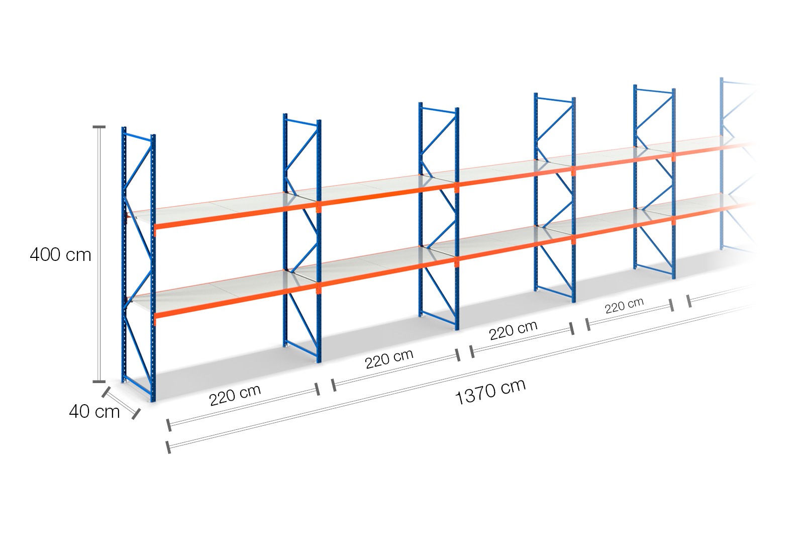 13,7 m storage rack LR2000 / 40 cm deep / 4 m high / 2 levels / rack layer Steel