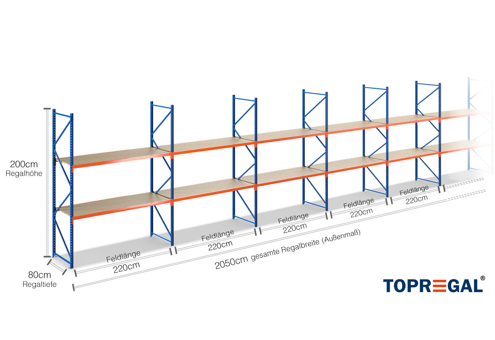 20,5 m storage rack LR2000 / 80 cm deep / 2 m high / 2 levels / rack layer Wood