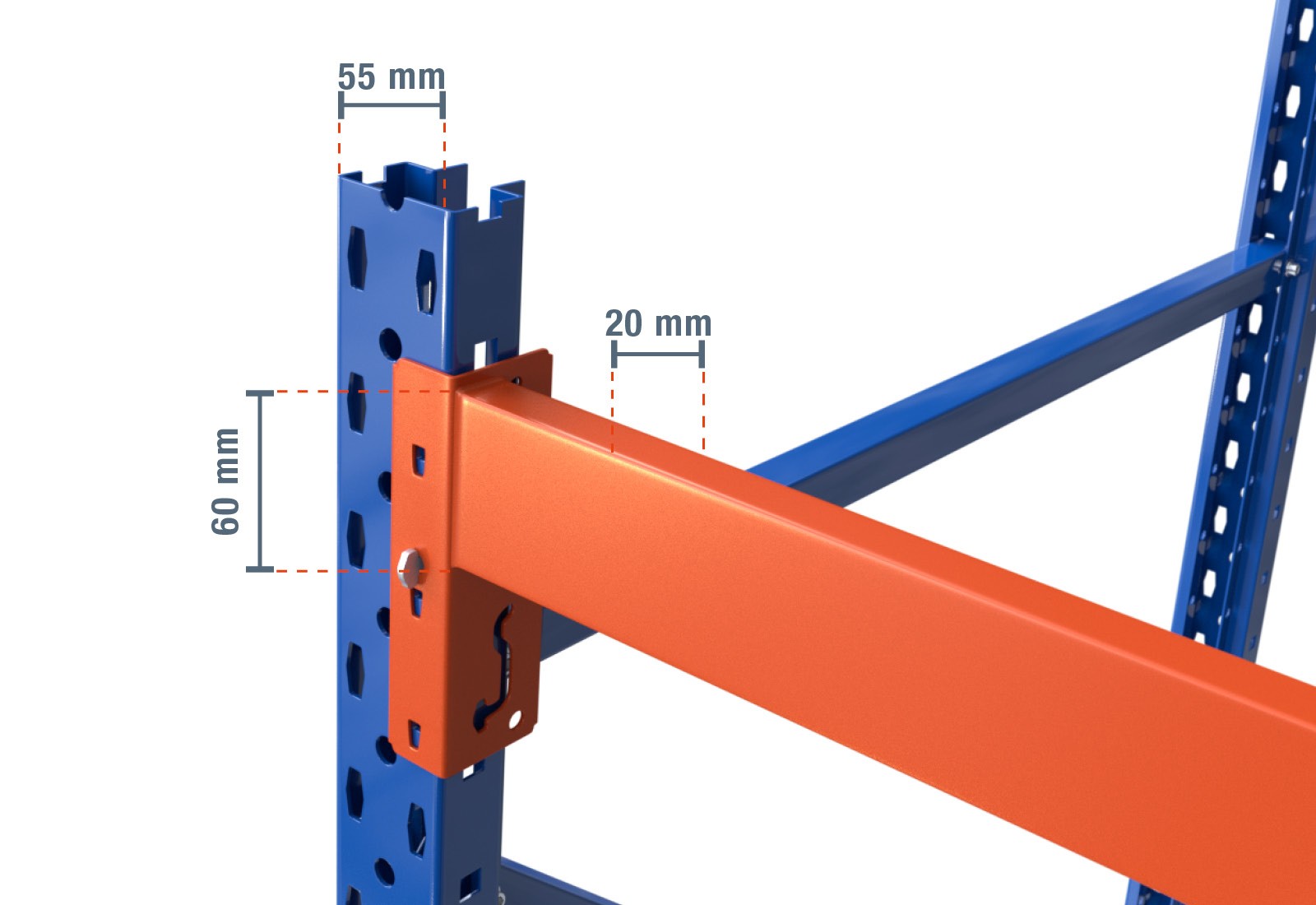 Assembly is complete in just a few steps. Thanks to the simple plug-in system, you can attach the beams individually in increments of 50 mm and secure them with safety pins. The modular system of our storage racks ensures that your rack can be widened at any time or expanded to include more levels. This racking type features an attractive appearance, with orange beams and blue storage rack uprights, as well as a robust and durable design.