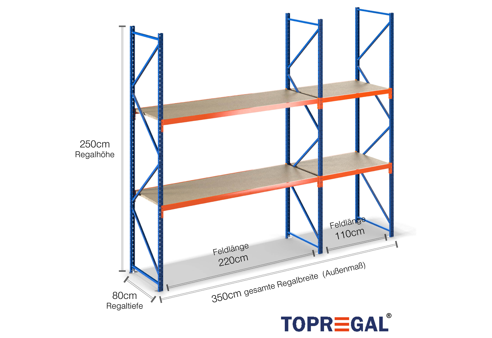 All data refer to evenly distributed loads. When loaded, the shelf load and field load must not be exceeded. In principle, the current guidelines on safety and health at work (german DGUV Rule 208-061) apply during use. TOPREGAL accepts no liability for accidents/damage caused by improper use. Our expert advisory team will be pleased to answer any questions you may have. Dimensions given are approximate and may deviate by a few centimetres. Contact us if you need the exact dimensions for your desired product.