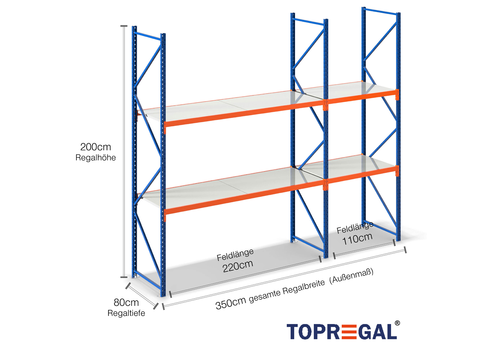 3,5 m storage rack LR2000 / 80 cm deep / 2 m high / 2 levels / rack layer Steel