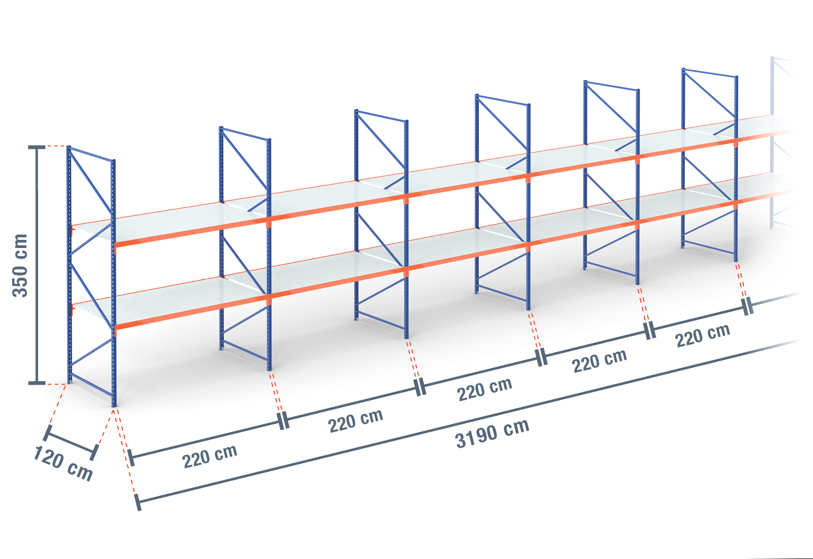 31,9 m storage rack LR2000 / 120 cm deep / 3,5 m high / 2 levels / rack layer Steel