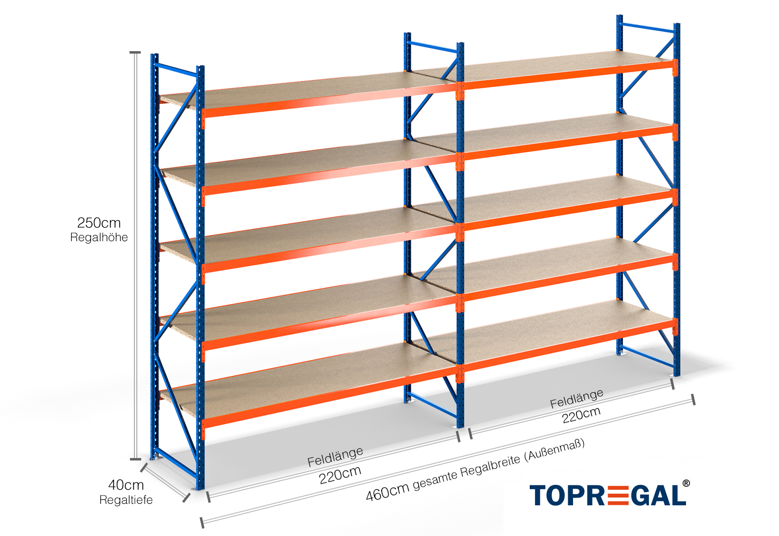 All data refer to evenly distributed loads. When loaded, the shelf load and field load must not be exceeded. In principle, the current guidelines on safety and health at work (german DGUV Rule 208-061) apply during use. TOPREGAL accepts no liability for accidents/damage caused by improper use. Our expert advisory team will be pleased to answer any questions you may have. Dimensions given are approximate and may deviate by a few centimetres. Contact us if you need the exact dimensions for your desired product.
