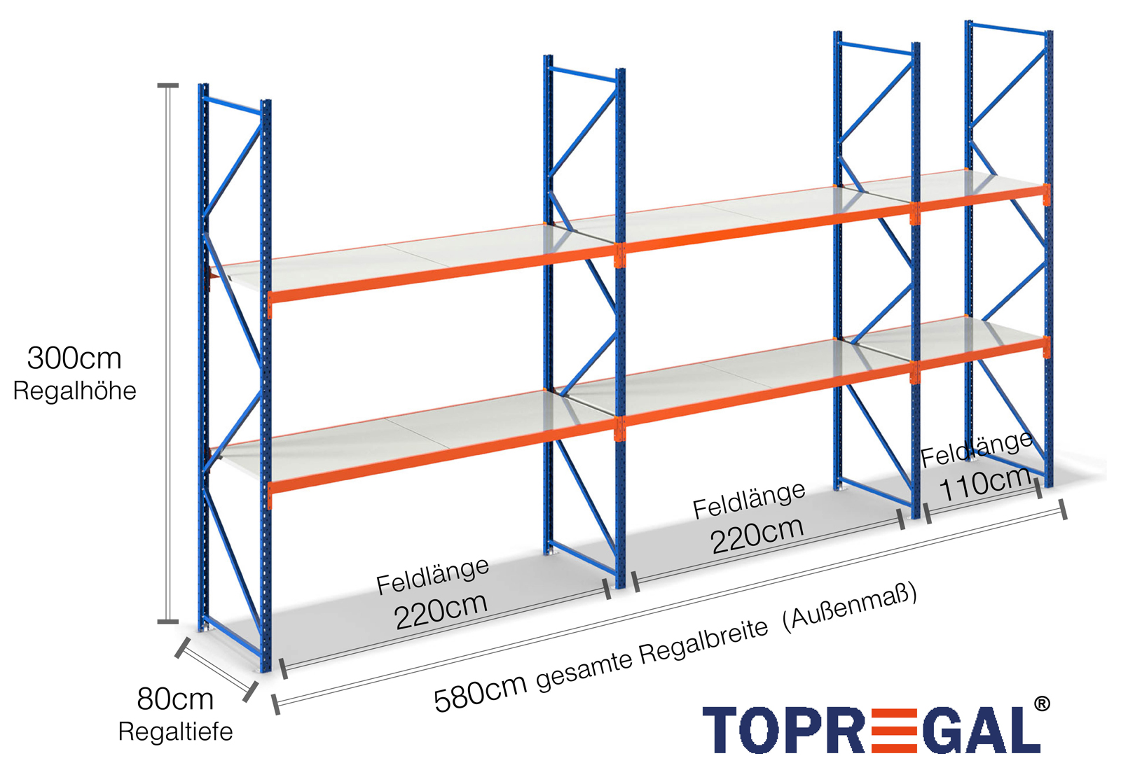 5,8 m storage rack LR2000 / 80 cm deep / 3 m high / 2 levels / rack layer Steel