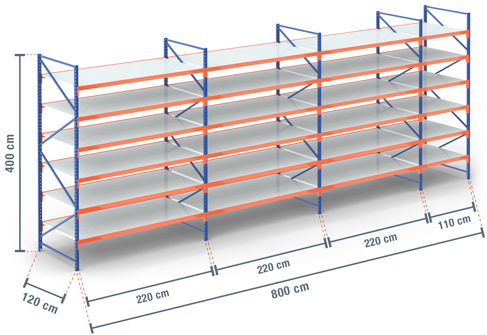 We offer you our storage rack in the depths 40 cm, 50 cm, 60 cm, 80 cm, 100 cm and in 120 cm.