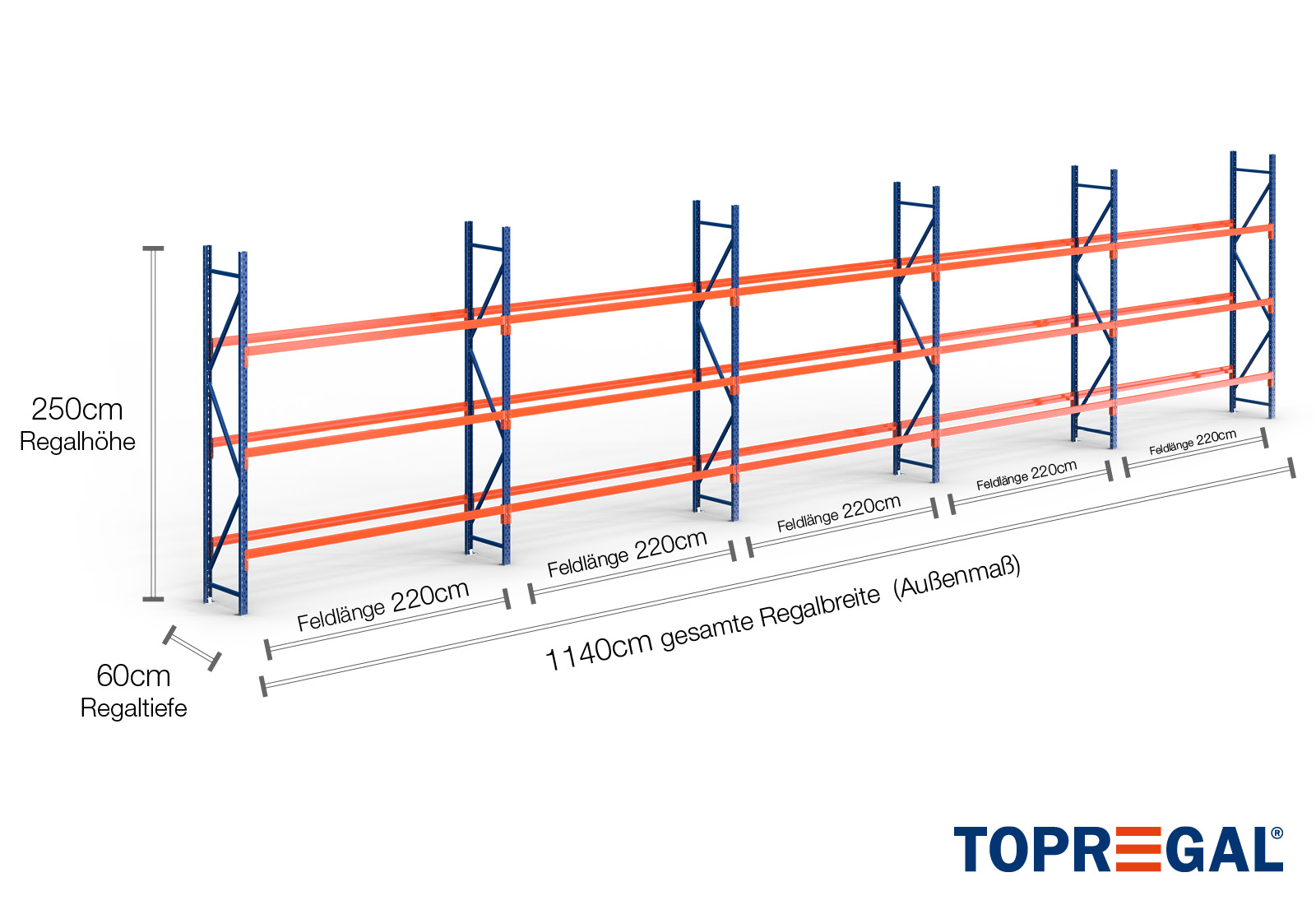 All data refer to evenly distributed loads. When loaded, the shelf load and field load must not be exceeded. In principle, the current guidelines on safety and health at work (german DGUV Rule 208-061) apply during use. TOPREGAL accepts no liability for accidents/damage caused by improper use. Our expert advisory team will be pleased to answer any questions you may have. Dimensions given are approximate and may deviate by a few centimetres. Contact us if you need the exact dimensions for your desired product.