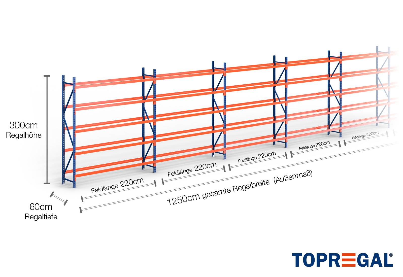 All data refer to evenly distributed loads. When loaded, the shelf load and field load must not be exceeded. In principle, the current guidelines on safety and health at work (german DGUV Rule 208-061) apply during use. TOPREGAL accepts no liability for accidents/damage caused by improper use. Our expert advisory team will be pleased to answer any questions you may have. Dimensions given are approximate and may deviate by a few centimetres. Contact us if you need the exact dimensions for your desired product.